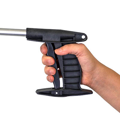 Lightweight reacher has an ergonomic trigger that is operated with whole hand. It is constructed with wired-driven jaws and the frame resists twisting and bending. It includes magnet for picking up metal objects and a hook to aid with dressing. These reaching aides assist individuals with limited reach and hand strength.
