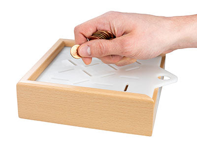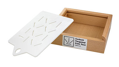 The Corbett Targeted Coin Test Box assess palm to fingertip In-Hand Manipulation (IHM). The test requires translating coins from palm to fingertips before coin insertion in vertically as well as randomly positioned slots. This skill requires a more complex visual-motor, differential tendon glide and proprioceptive coordination than most pegboards tests. Clinicians ...Show more