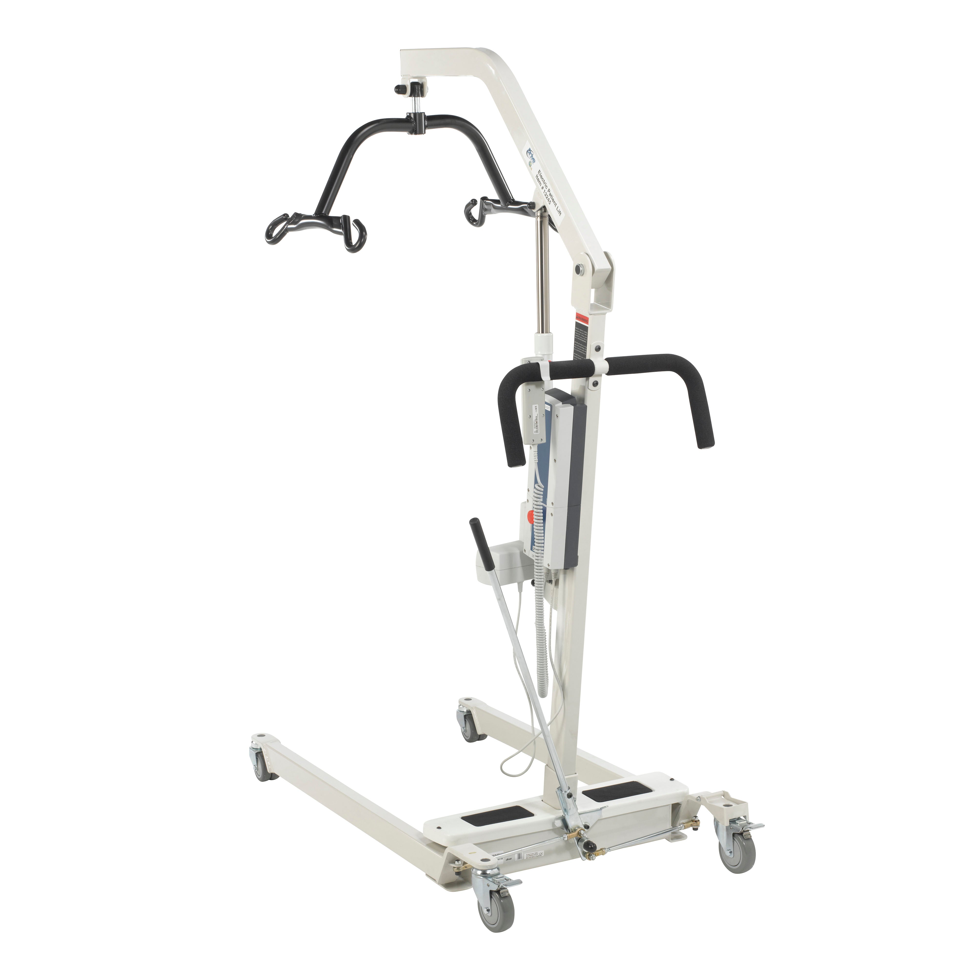 With a 600 pound weight capacity, this bariatric battery-powered lift with non-removable rechargeable battery by Drive Medical has strength on its side. The extra wide, coated cradle rotates 360 degrees and includes 4-point hook up. A high lift range allows the unit to transfer patients to high surfaces. The battery can be charged by plugging in the unit, and never needs to be removed (The lift will not operate while plugged in). A jumbo actuator pump that lowers the patient ensures safe repositioning. The pump even includes an emergency button and can be switched to manual mode. Sturdy base legs - with dual, 3" heavy duty front casters - adjust easily and lock securely into open position with padded shifter handles.