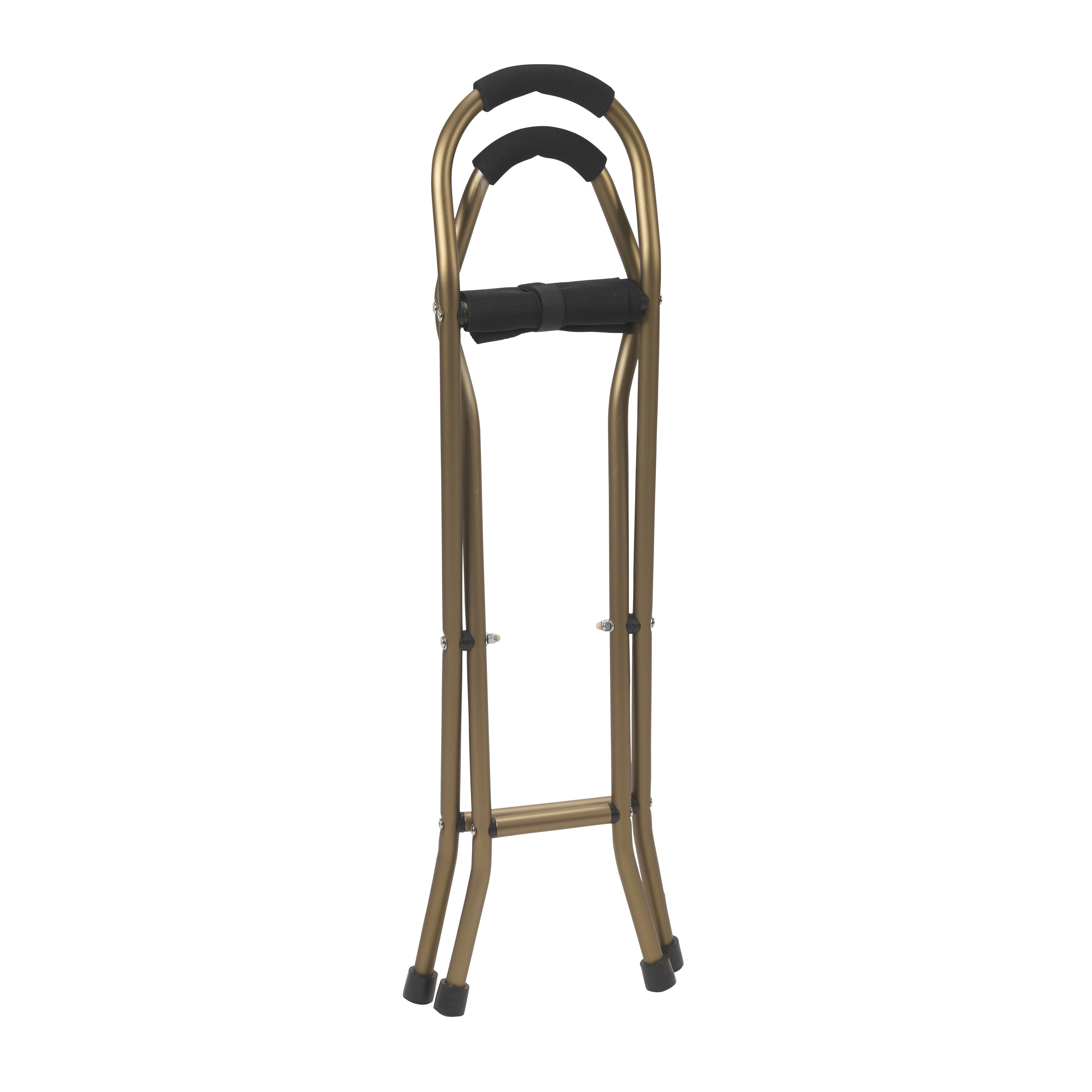 This deluxe folding aluminum seat cane by Drive Medical features convenience right out of the box. Ideal for individuals on the go this cane can be used as a resting seat or traditional walking cane. The sling material provides a comfortable seat for resting when opened. When closed this cane increases mobility and ensures maximum safety and security. Strong aluminum bronze construction and four sturdy legs with vinyl contoured tips can support a weight capacity of 250 pounds. The 15" x 6" nylon sling seat sits 22" from the floor when open, while the cane stands 34" tall when closed and weighs just 2.4 pounds. Foam grip handles on both arms provide additional comfort.