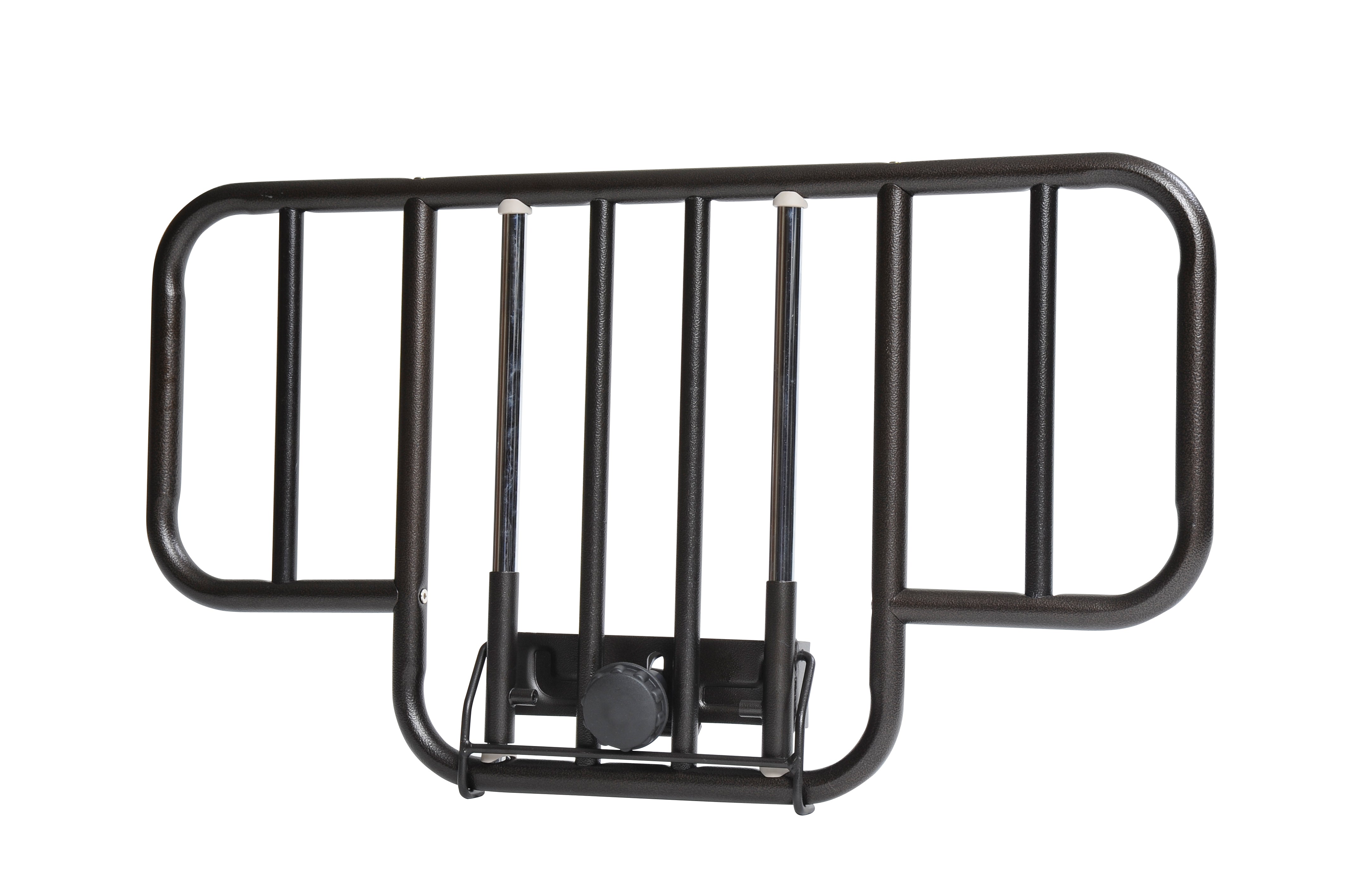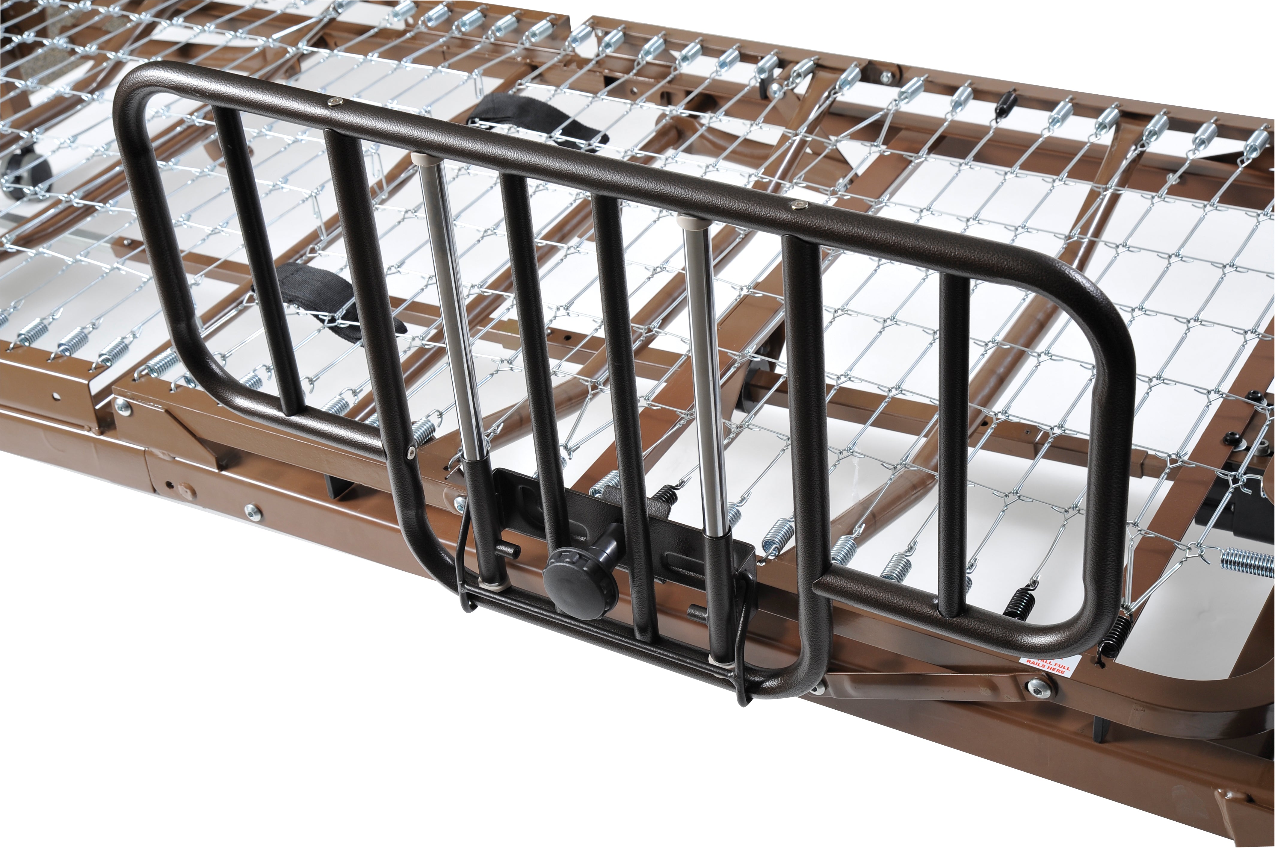 A unique design saves you from worry on this no-gap deluxe half length side bed rail by Drive Medical. It prevents individuals from being lodged between bars. The 1" steel construction with brown vein finish is durable and strong yet attractive. The rail fits most hospital beds with a steel frame and is ideal for maximum protection with the bed elevated. These rails install easily making them the perfect half length bed rails. (Not for use with "Pan-Style" bed surfaces.)