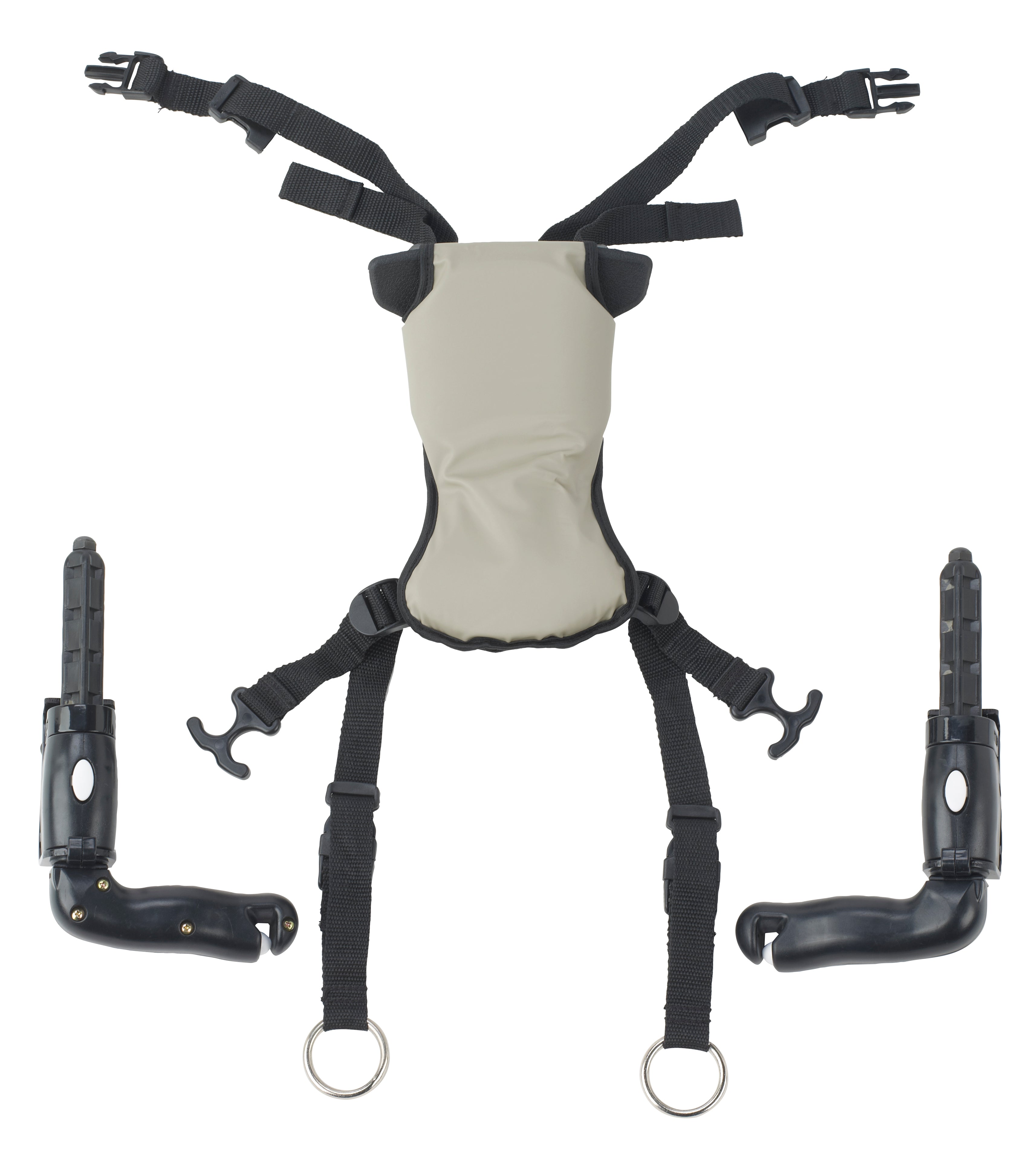 The Hip Positioner and Pad works with the Trekker Gait Trainer to position the hip and pelvis and allow the user to shift weight from one leg to the other. The straps can be shortened to assist in weight bearing or lengthened to use as a safety sling.
