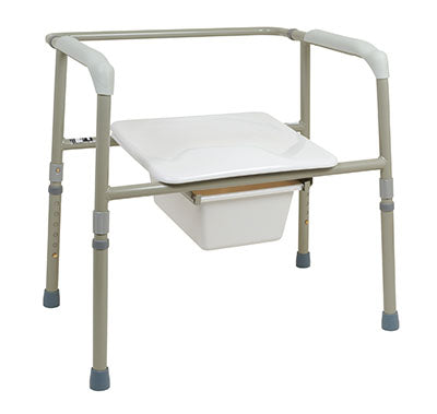The Three-in-One Bariatric Commode helps assist you with your chronic or temporary medical mobility challenges. This versatile commode can be used as a toilet safety frame, a commode, and a raised toilet seat all in one. It can act as a free-standing commode with its angled legs for stability or function as a raised toilet seat with its plastic armrests which ...Show more Dimensions: 28" x 14" x 16"