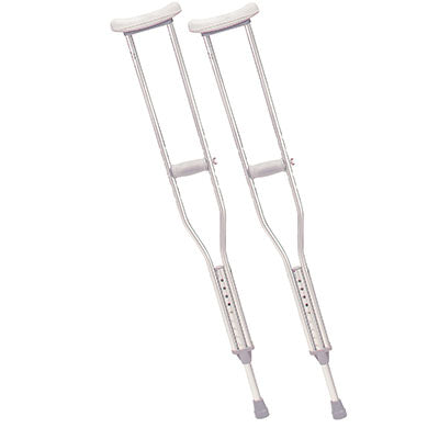Lighter than wood, this walking crutch by Drive Medical provides stability and durability. Each crutch is manufactured with a double extruded center tube to ensure additional strength on weight-bearing areas. Extra thick (latex free) underarm pads and hand grips provide maximum comfort when in use. Tool free push-button adjustment allows the height of the underarm