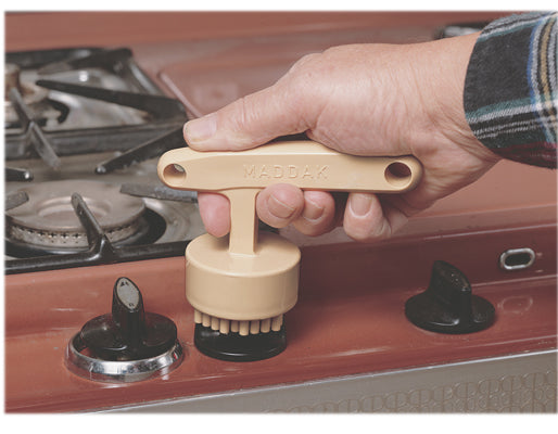 It can be used on any non-round or ribbed knob or appliance handle. The grip is secured when pressed onto knob. Measures 2¼" in diameter but can grip larger irregular-shaped knobs. The T-shaped handle measures 5¼" long. Dimensions: 8.75" x 2.5" x 6"