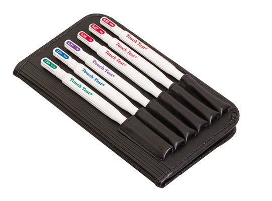 The Touch-Test monofilament bends when peak force threshold is reached. Test sensory levels and obtain objective data on the status of diminishing or return insensibility. Handle opens to a 90° angle. Finger indentations on handle provide a firm, comfortable hold. Color code shows pressure level. Comes in a protective case with instructions included.