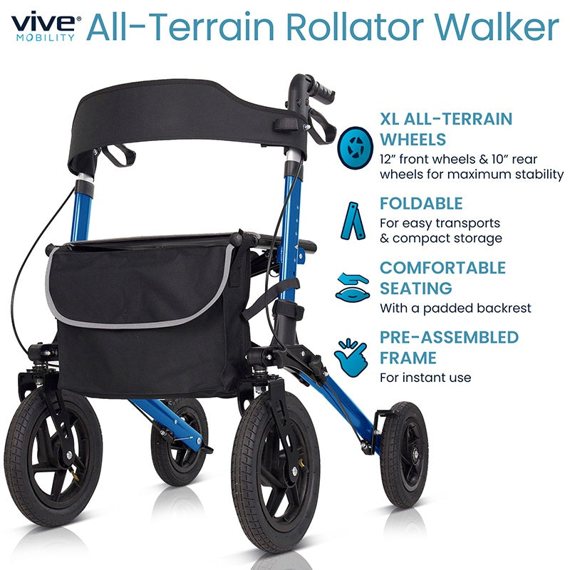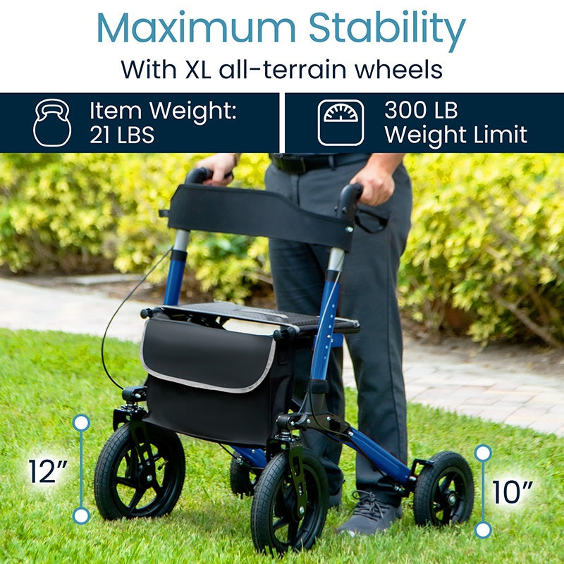 The all-terrain rollator is designed for smooth and stable mobility on any surface, featuring large 12” to 10" wheels that easily navigate rocks, gravel, pavement, dirt, and grass. Its dual-braking system enhances safety by securely locking the wheels in place when needed. Crafted from lightweight yet durable aluminum, the rollator supports up to 300 pounds and is corrosion-resistant, making it ideal for both travel and home use. The rollator also boasts an upgraded padded seat with a wide seating area and supportive backrest, ensuring a comfortable and enjoyable sitting experience. Additionally, the included portable storage bag allows you to keep personal items within easy reach, providing added convenience wherever you go.