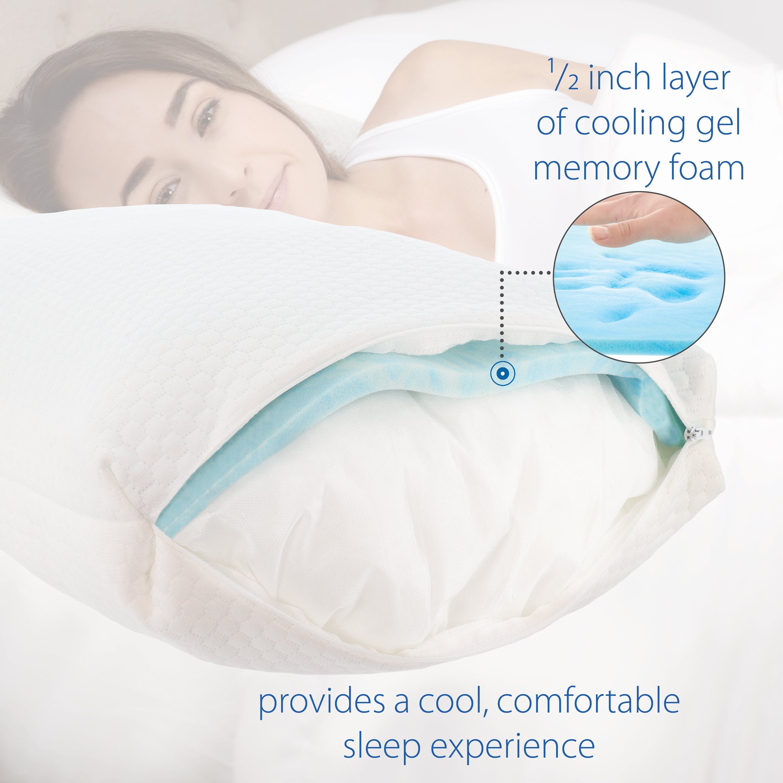 Stay comfortable by laying on the side featuring a layer of cooling gel memory foam. Memory foam will gently cradle and conform to the shape of the head and neck and reduce pressure to help relieve pain and soreness for a restful, restorative night's sleep.