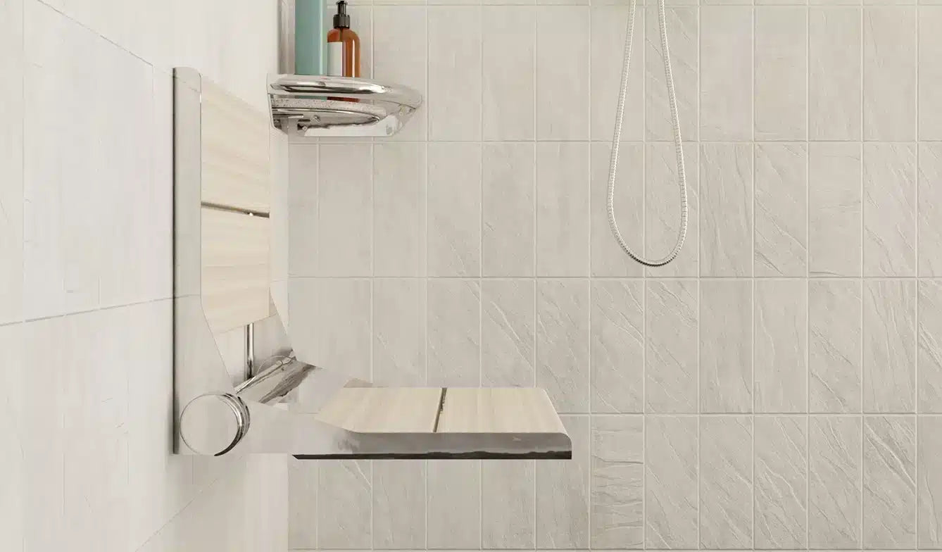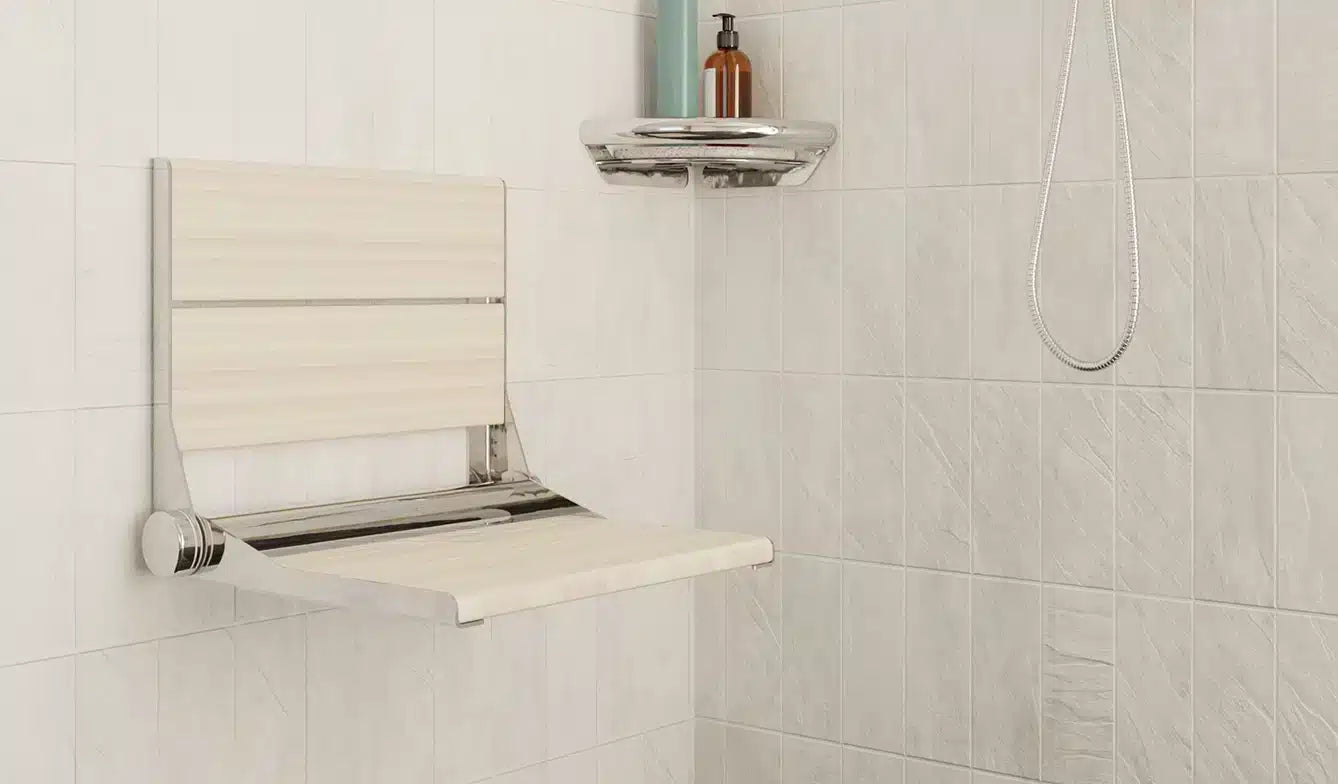 INVISIA™ SerenaSeat™ Pro Stainless, 18" Width, Light Stain, Polished Chrome Frame - INV-WSFD-18-LIGHT-CP