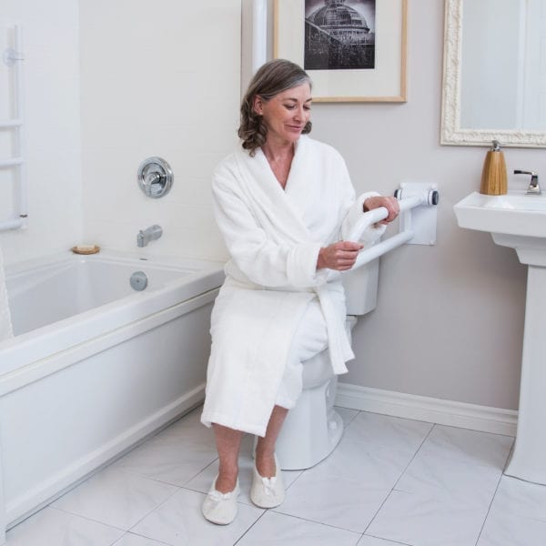 Unlike other bathroom safety rails, the PT Rail is designed with an innovative offset rail to avoid wrist strain when you’re sitting down or pulling yourself up from a seated position. The PT Rail is also easily stored; simply lift the rail until it is flush against your bathroom walls.