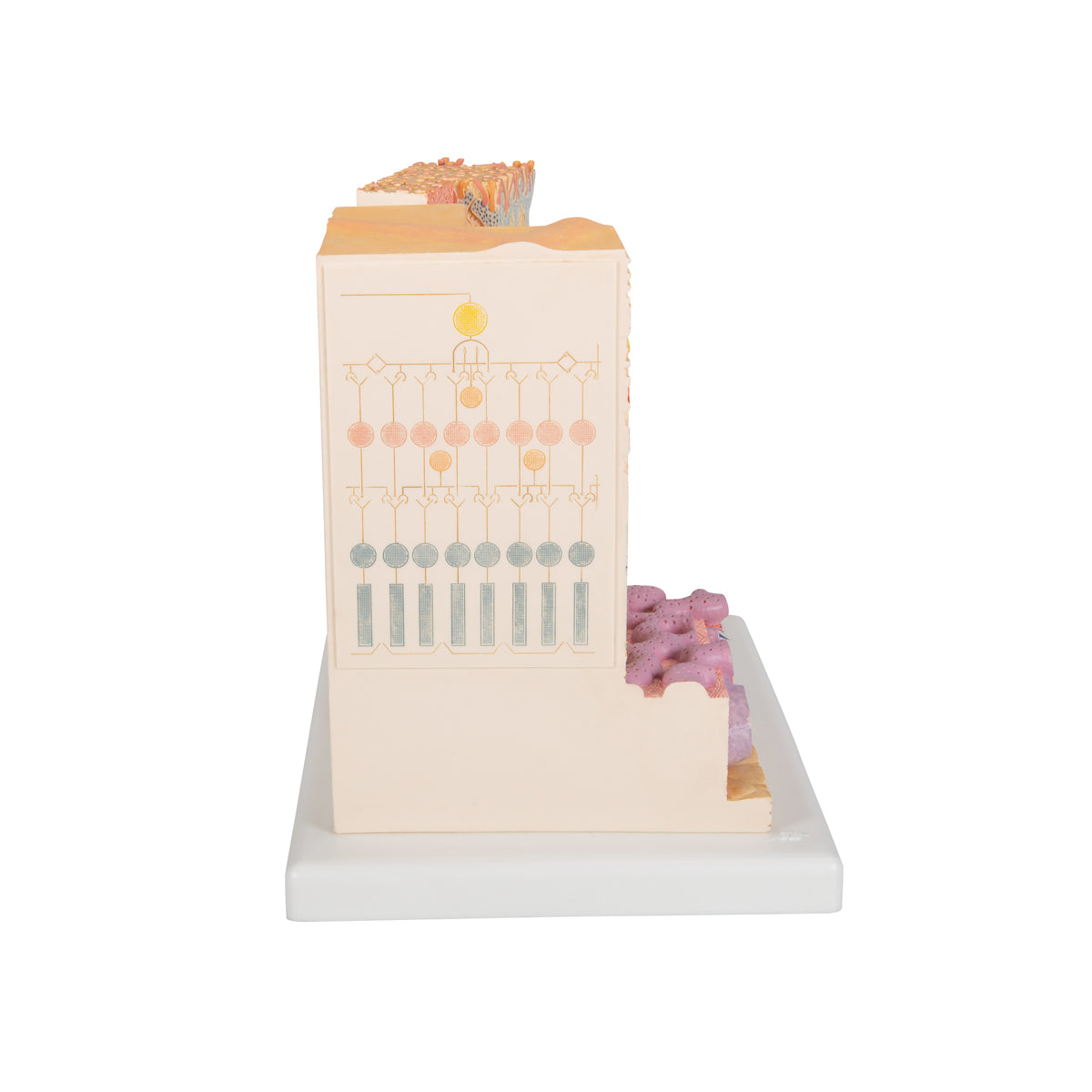 The MICROanatomy Eye model illustrates the microscopic anatomical structure of the retina with choroid and sclera. The left block-like, layered side of the eye model shows the complete structure of the retina including the supplying vascular layer and parts of the sclera from a light microscopic view.