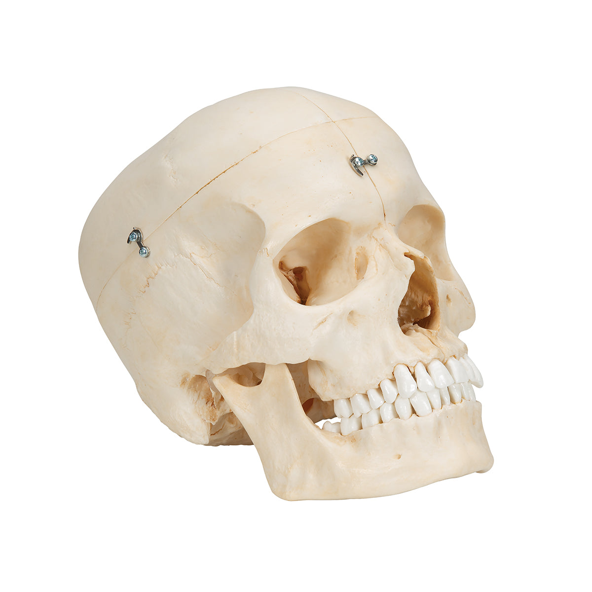 This BONElike skull model brings the realism of human anatomy to any classroom. The BONElike Skullsare made of a new material that allows an absolutely natural reproduction of even finest anatomical structures of the human skull for the first time. Bones made of 3B BONElike look real, have an absolutely natural feel and almost exactly the weight of a natural bone. This version represents a complete midsagitally sectioned skull. The skull-cap can be disassembled into 2 halves as can the base of skull. The nasal septum and the complete mandible are also removeable. To demonstrate masticator movement, the lower jaw is mounted flexibly. An excellent skull to study the bony structure and the complicated anatomy of the human skull.