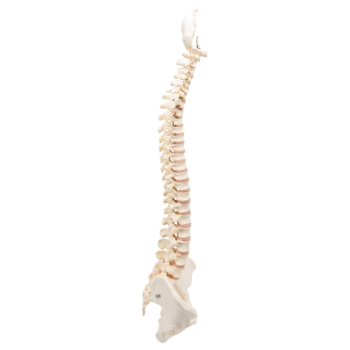 This anatomical replica of the human spine is a flexible, mounted, true-to-life model of the human vertebral column in excellent BONElike quality. The spine is an original reproduction of all anatomical details, based on real weight. The spinal column model consists of the male pelvis and occipital bone. Occipital bone and atlas can be detached individually from the spine. This vertebral column is delivered without stand, see A59/8.