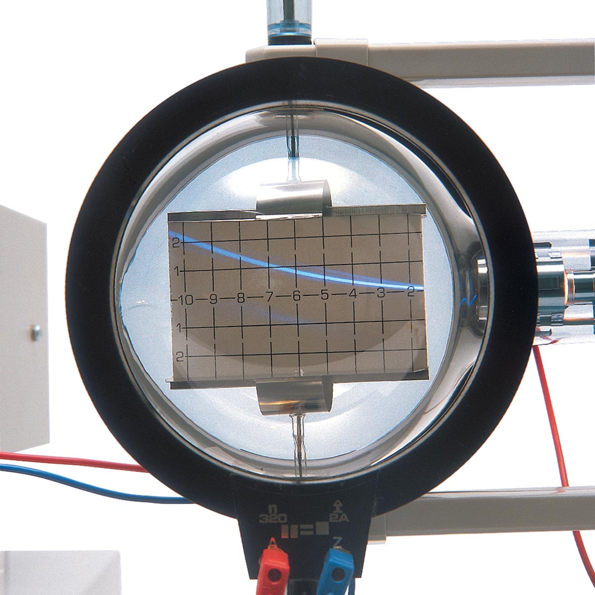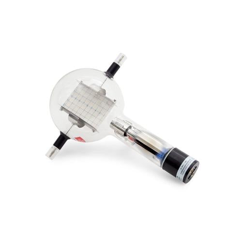 Highly evacuated electron tube with focusing electron gun and fluorescent screen inclined relative to the beam axis, so that the path of the beam can be seen and the effects of electric and magnetic fields can be studied. The electron beam can be deflected electrically in the electric field of the built-in plate capacitor, and magnetically by using the Helmholtz coil pair D (U191051). By adjusting the electric field so that it cancels the magnetic deflection, it is possible to determine the specific charge e/m and the velocity of the electrons.