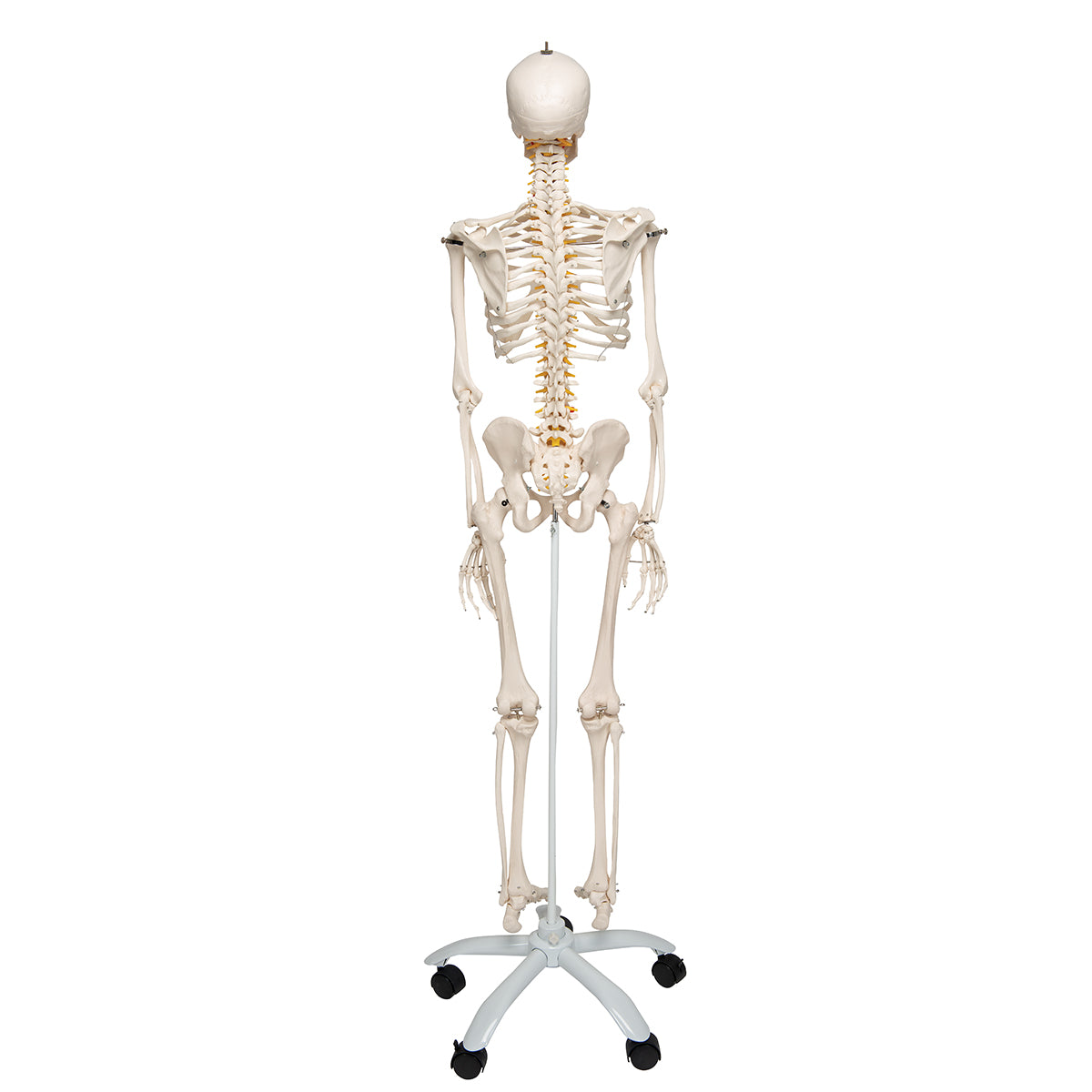 Fred offers all the advantages of a 3B Scientific® skeleton. Fred's bendy spine can copy almost any human movement too. Once bent, Fred will remain in that position, to show correct and incorrect postures as well as any pathological malalignments. All skull movements can be shown on the head joints. Protruding spinal nerves and vertebral arteries are also shown on this skeleton, as well as a dorsolateral slipped disc between the 3rd and 4th lumbar vertebrae. Now available on a stable metal stand with 5 casters!