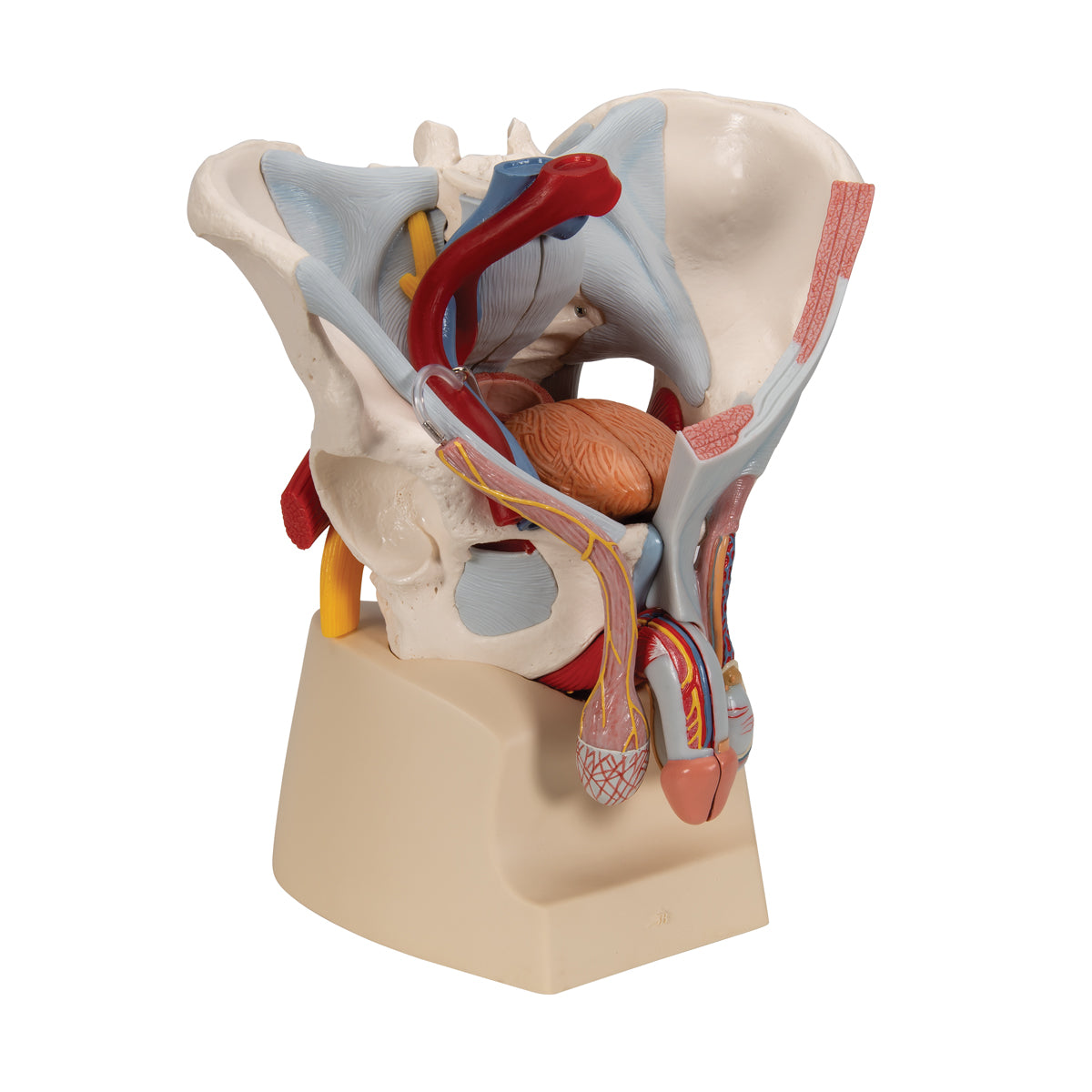 This 7 part model of the male pelvis shows in accurate detail how the bones, ligaments, vessels and nerves as well as the pelvic floor muscles and the external sex organs are connected to each other. It shows the whole pelvis, through which a median section has been placed. The right side of the external anal sphincter, the M. ischiocavernosus, the M. transversus perinei profundus and superficialis and the M. bulbospongiosus can be removed together.