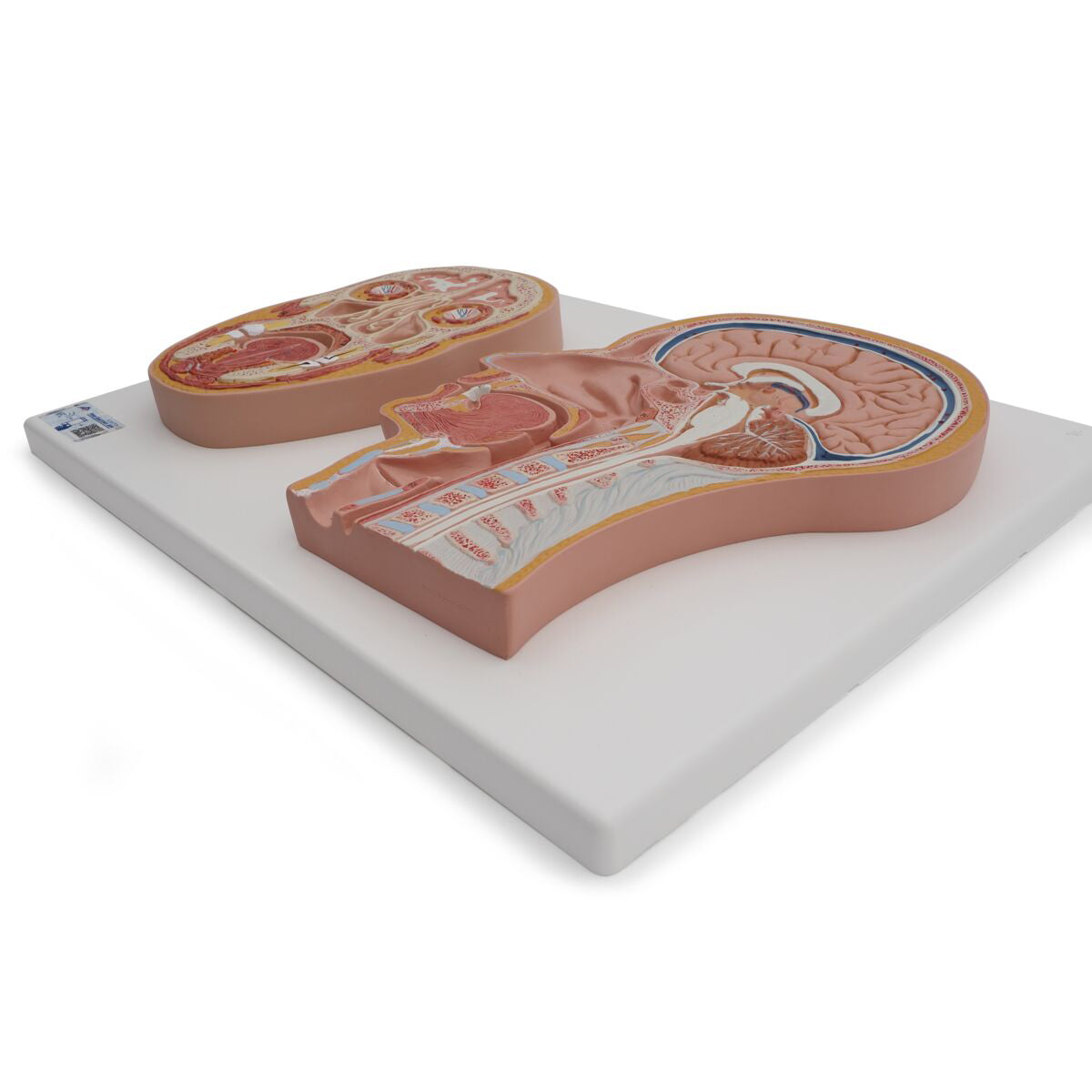 The 2 relief models show the median and frontal section of the head on baseboard. This two views of this high quality model shows the important anatomical structures of the head in full detail. Important anatomical structures include cross sections of the brain, spinal cord, and sinuses of the human head.