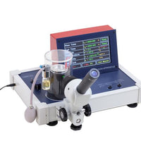 Compact apparatus for demonstrating the discrete nature (quantisation) of electric charge and for determining the elementary charge of an electron. Comprising an experiment chamber kit for assembly with plate capacitor and connected oil atomiser, lighting unit with two green LEDs, measuring microscope, voltage adjustment knob and switch to set the capacitor voltage, switch for starting and stopping rise and fall time measurements and a display unit with touch screen. Measurements can be made using the floating method or the rising and falling method. Measured rise and fall times for a charged droplet of oil are displayed on the touch screen along with the configured voltage. Parameters relevant to the evaluation of the results, temperature, viscosity and pressure are also displayed. Includes plug-in power supply, 12 VAC, 1 A.