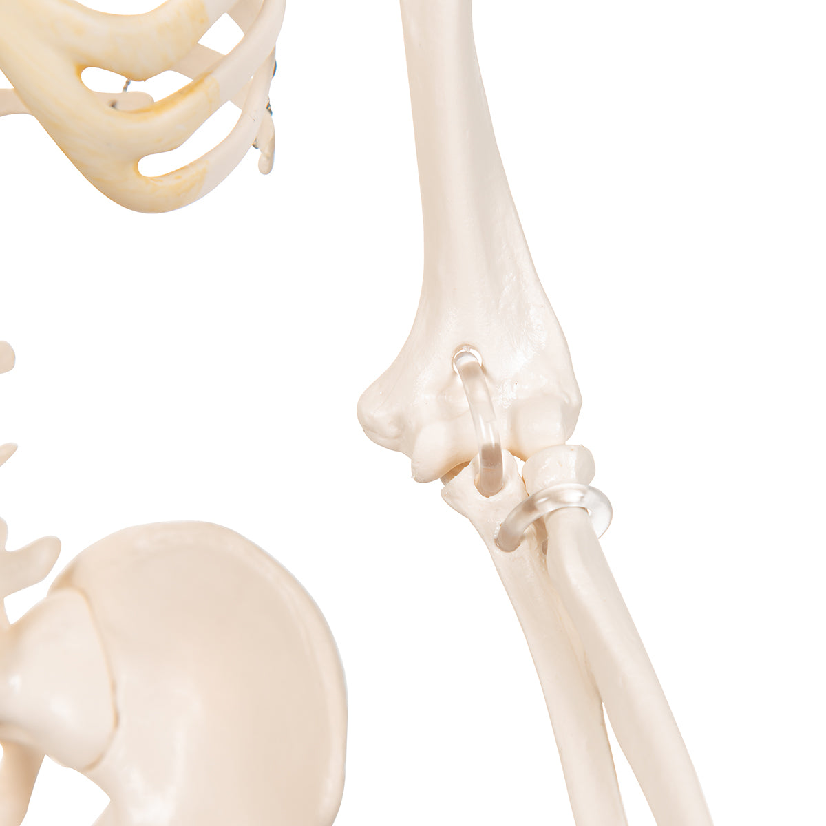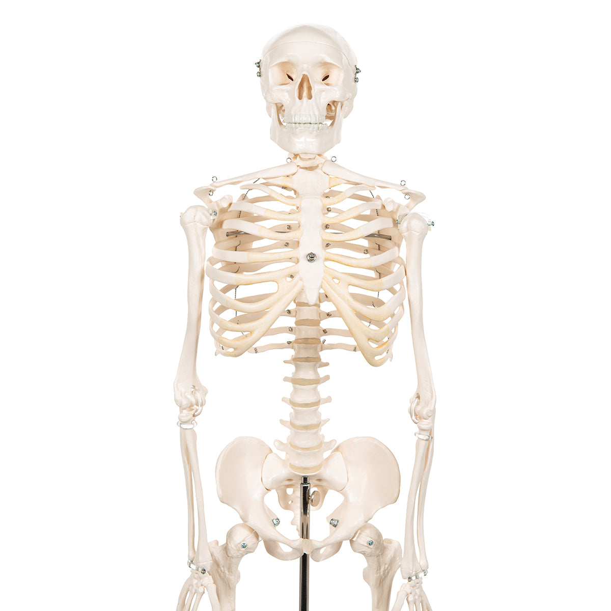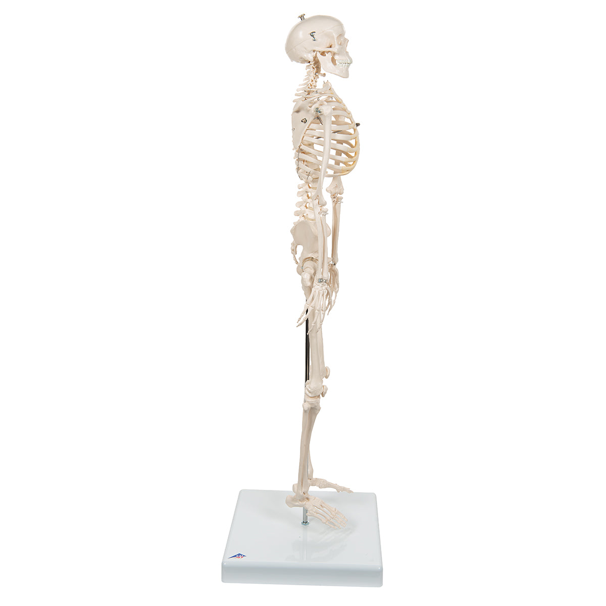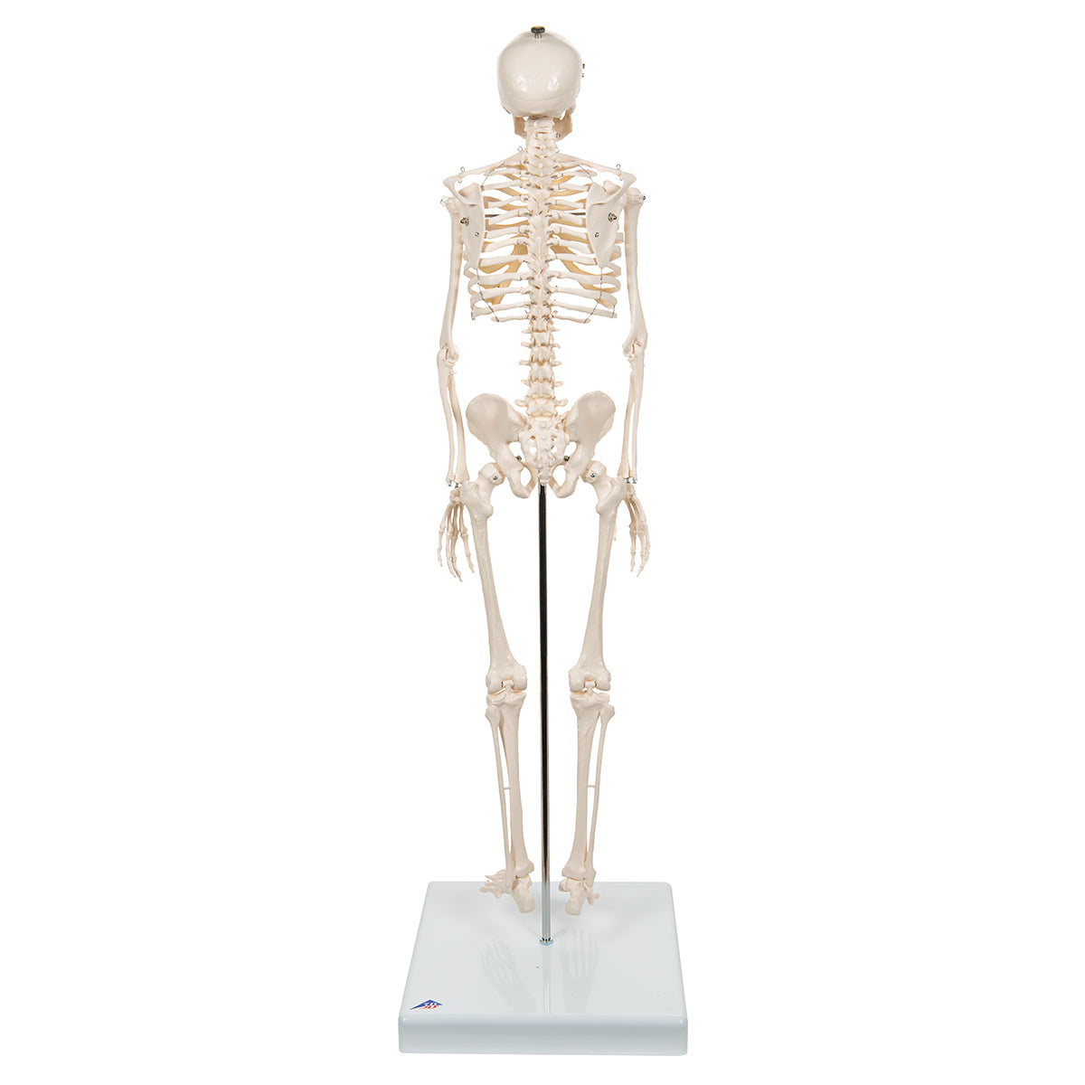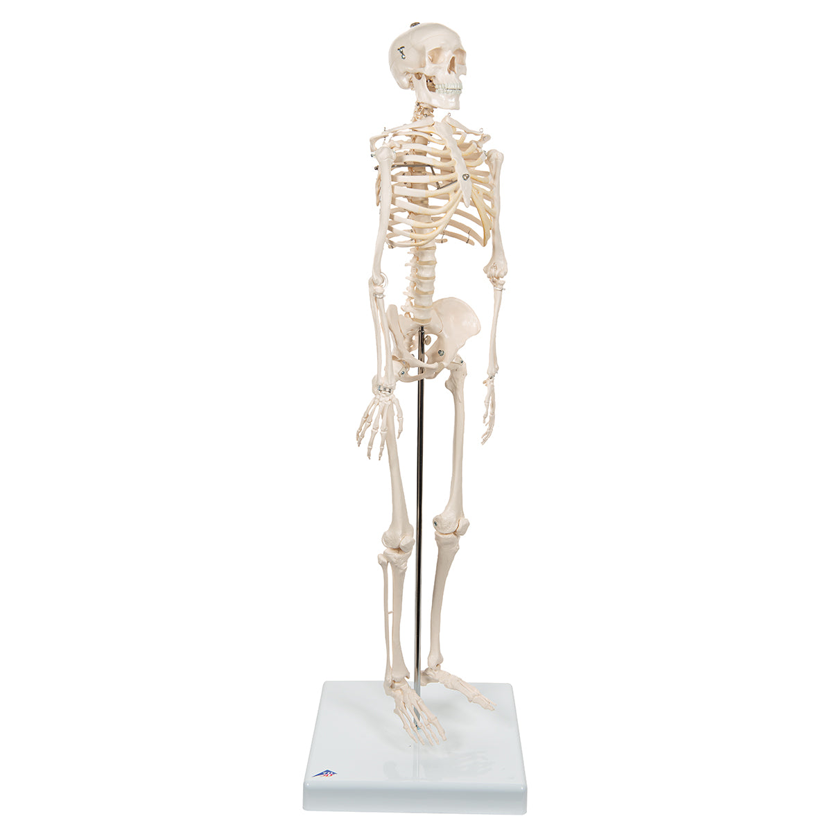 Top of the range mini human skeleton. Skillful 3B engineers using powerful hardware and software optimized the process of reproducing miniatures in order to keep all anatomical details and structures even at half natural size (80 cm). This mini skeleton can be taken off of its base when required. The skull can be removed and disassembled into three parts (skullcap, base of skull, mandible). The arms and legs are removable. The hip joints are specially mounted so their natural rotation can be demonstrated.