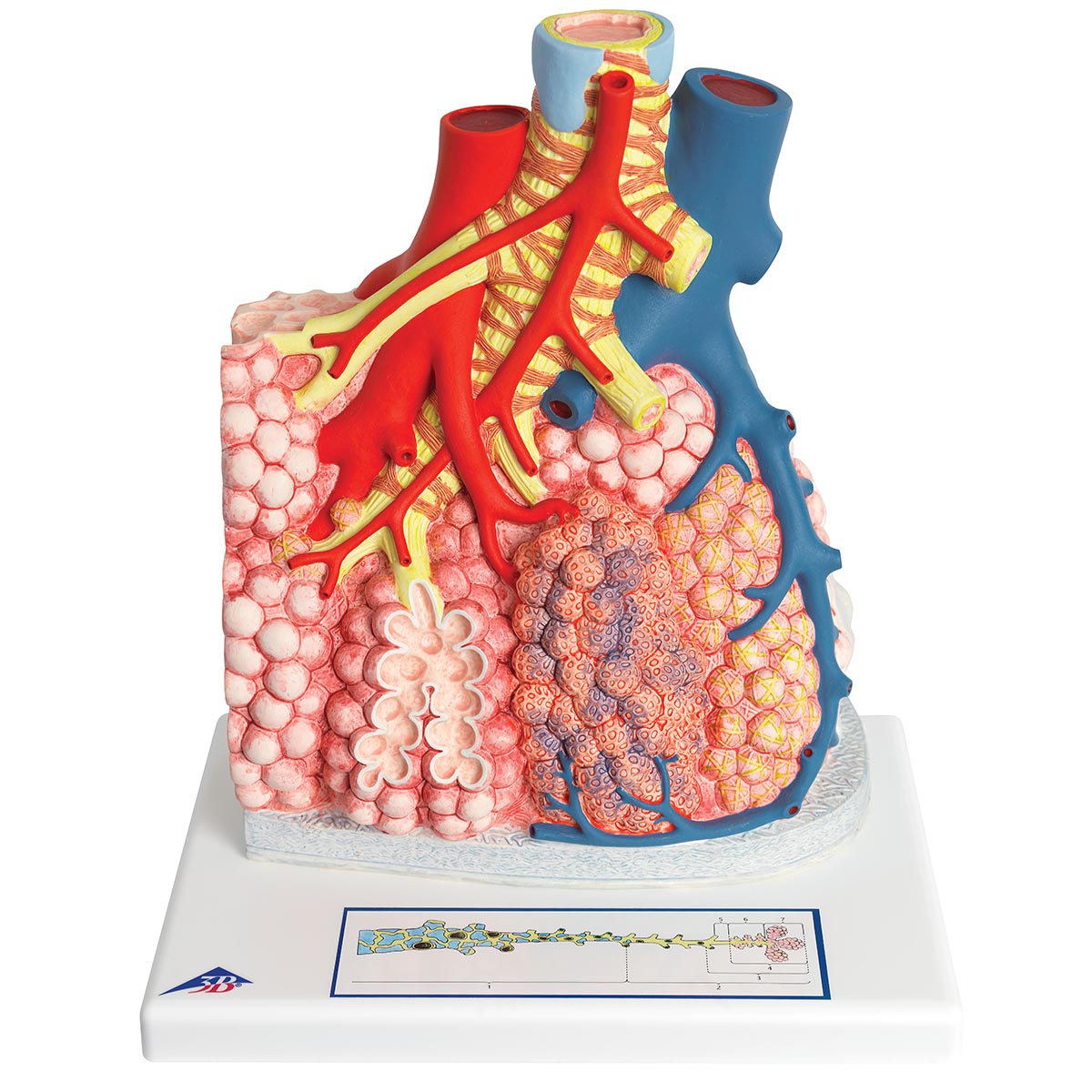 A graphic image on the stand of the model shows the structure of the air way in the lungs up to the alveolus.