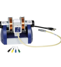 The set consists of the factory-set base unit with the two magnetic coils, the NMR probe, glycerine sample, polystyrene sample, Teflon sample and an empty comparison sample. A measurement report is supplied with each NMR module. The resonance frequency for glycerine and the strength of the permanent magnetic net field for the respective module are specified in this report. An unambiguous assignment is guaranteed via the S/N on bottom of the device e.g. 203067-1, if several modules have been purchased.