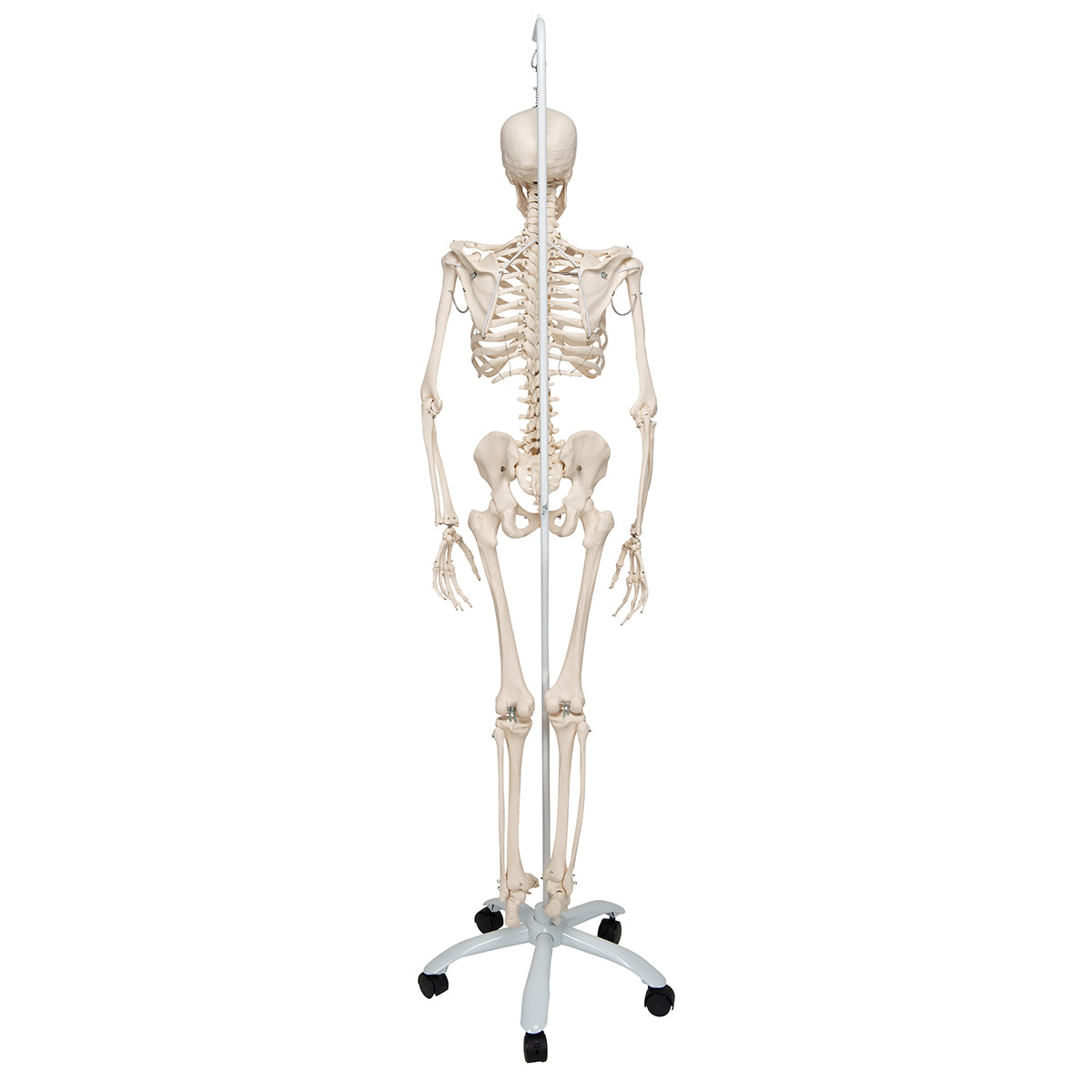 Phil is unique! He offers all the advantages of a 3B Scientific® skeleton and features an almost true-to-life reproduction of the joints system. Demonstrate internal and external rotation of the limbs and show how the knee and elbow joints move and stretch. The flexible spine can make natural movements (lateral bend, movement and stretching, rotation). The hand bones of this 3B Scientific® skeleton model have been assembled on wire to show their natural position. The flexible assembly of the foot bones makes them maneuverable. The shoulder blades twist when the arms are raised. Even the low level of maneuverability of the sacroiliac joint and the sacrococcygeal symphysis can be demonstrated. Now available on a stable metal hanging stand with 5 casters!