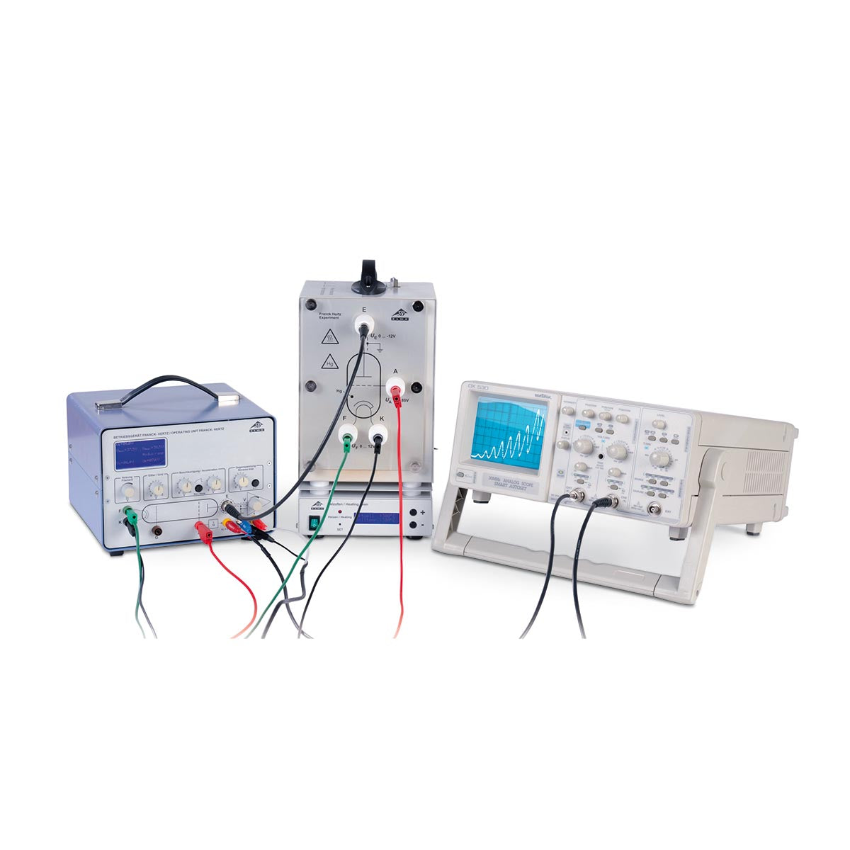 Power supply unit for operating the mercury filled Franck-Hertz tube (U8482550-230 resp. U8482550-115), the neon filled Franck-Hertz tube (U8482230) or the critical potential tubes (U18560 and U18565). The equipment provides all the voltages needed to power the tubes and includes a sensitive built-in DC amplifier for measuring collector current. The voltages can simultaneously be read off a display. The accelerating voltage can be set-up manually on the apparatus or set to a saw-tooth wave form. Additional measuring inputs are also available for the anode current and accelerating voltage.