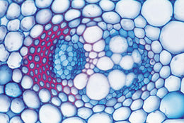 Botany: 46(c) Nostoc, blue green alga, filamentous colonies within gelatinous sheaths 47(e) Desmids (Desmidiaceae), strewn slide of various species 48(c) Sphagnum, peat moss, w.m. of leaf showing chlorophyll-bearing and hyaline cells. 49(c) Triticum, wheat, t.s. of stem of a gramineous plant with central pith and circular arrangement of bundles 50(c) Salvia, sage, t.s. of a square stem with angular collenchyma.