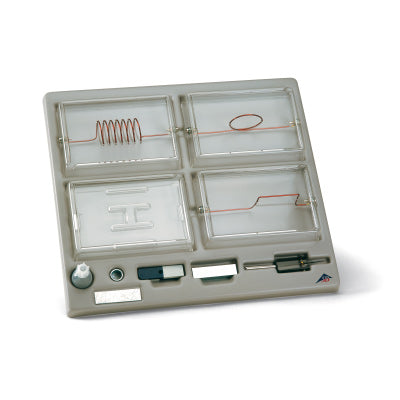 Equipment set for demonstration experiments designed to make visible the magnetic field distribution of permanent magnets and current carrying conductors. Also compatible for use with a daylight projector. The acrylic glass boxes containing iron filings are equipped with a pouring lip so that the used fillings can easily be refilled into the storage bottle.