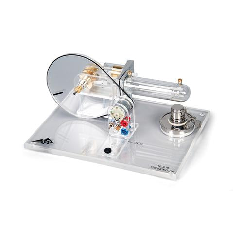 The Transparent Stirling Engine is ideal for quantitative investigations of cyclic thermodynamic processes and specifically for understanding the Stirling cycle. The integrated generator has a two stage belt pulley and is equipped with a switchover option for operating an integrated lamp, external loads, or demonstrating the processes of a heat pump or refrigerator. Includes integrated engine generator and alcohol burner. Fuel not included; please use methylated-spirits, i.e. denatured alcohol.