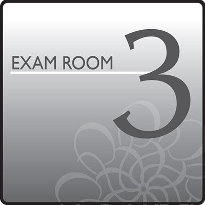 Simple, direct and understated define these Standard Exam Room Signs from Clinton. This Exam Room Sign features dark gray text over a gray background and features a simple geometric pattern. This is an individual sign noting Exam Room 3. All Ocean Series Office Signs are available individually. Durable, each sign is pre-mounted on ridged black plastic. Signs
