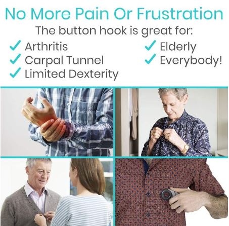 The This Brand patent-pending button hook has a superior shape for a comfortable grip and includes an opening for the index finger to provide greater security and easier maneuverability. Perfect for weak or arthritic hands, the latex-free cushioned handle is also comfortably wide to provide greater control when securing buttons or zipping pants, shorts, jackets or other clothing.