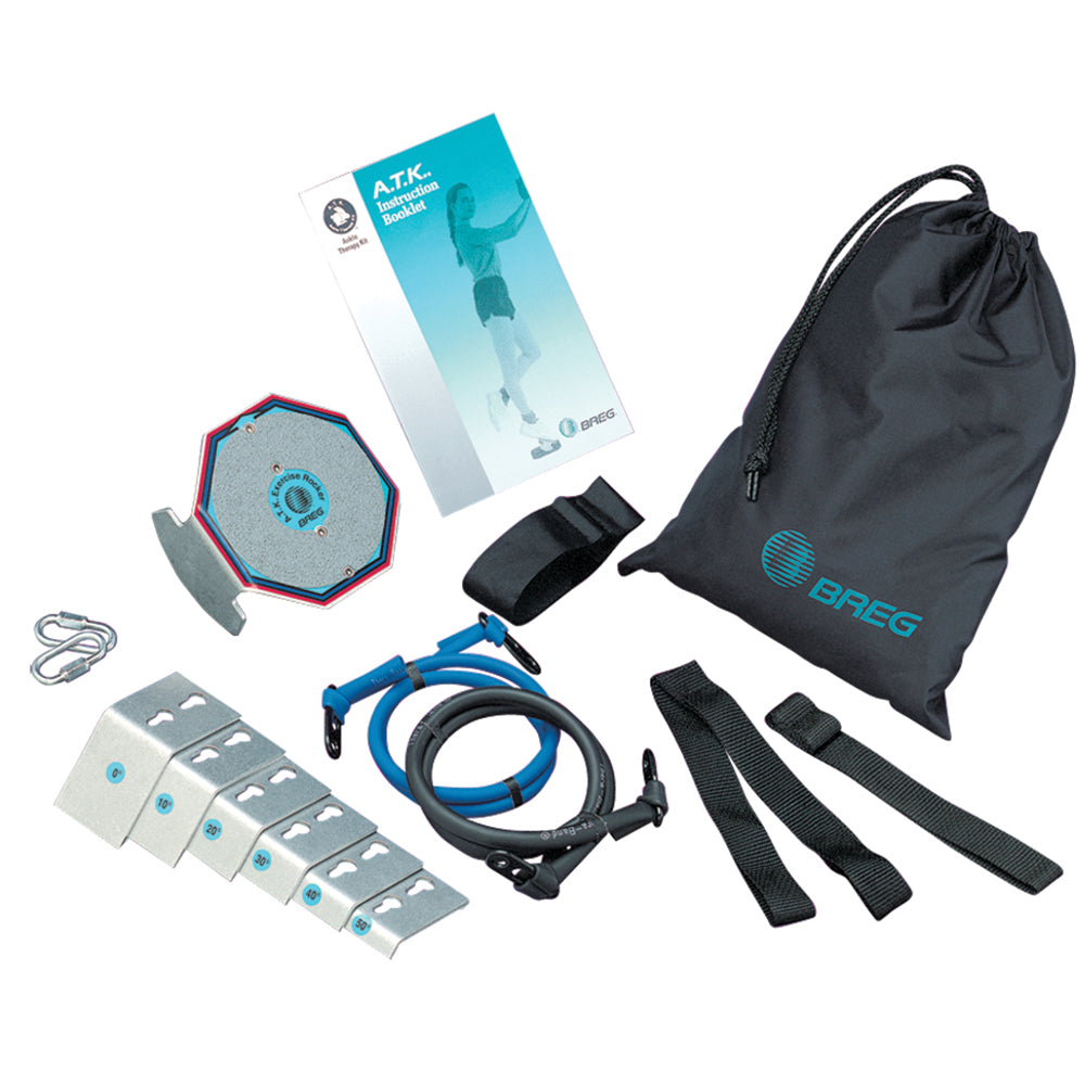 Allow for custom rehabilitation programs. Ankle kit includes instruction booklet, exercise rocker with nonslip top, rocker stop set, (2) 3' rubber tubes, door strap, ankle strap, 2 clips and exercise strap. Knee kit includes instruction booklet, weight bag (up to 10 lbs.), 2 rubber tubes, inflatable pillow (23" circumference when fully inflated, provides approximately 6" of elevation), rope and pulley, 2 door straps, ankle strap, 46.75"-long belt and 2 clips. Shoulder kit includes instruction booklet, 36" collapsible bar for range-of-motion exercises, rope and pulley to allow for a multitude of shoulder and elbow exercises, 3 rubber tubes, and a door strap.