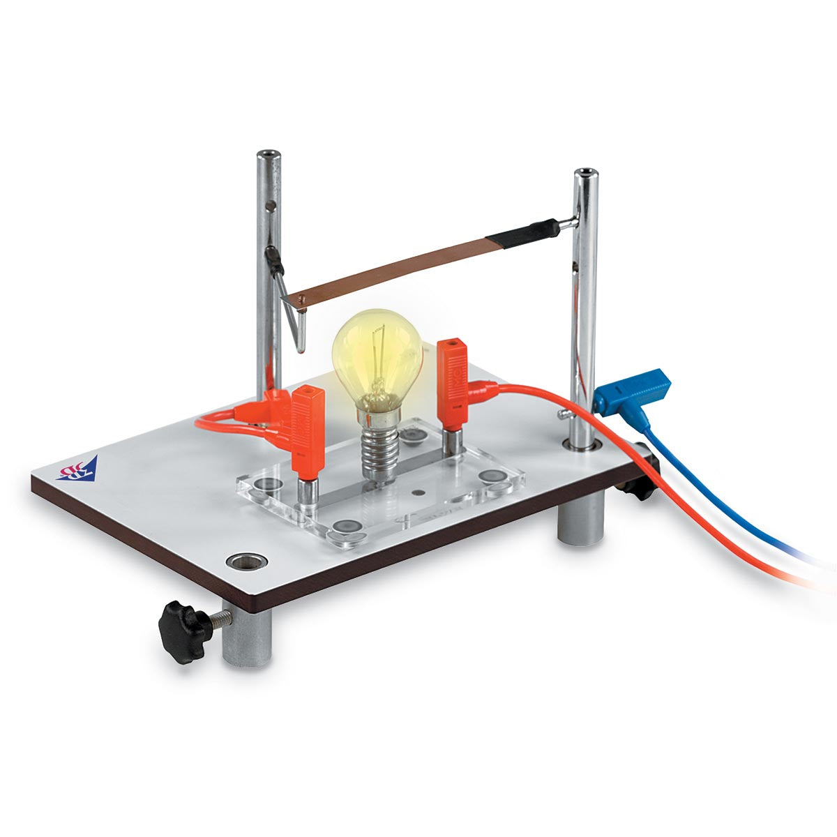 Assembly Kit “Bell, Relay and Bimetallic Switch ” Equipment kit comprising materials to assemble electromagnetic switches and bimetallic switches. Base plate in mm (L x W x H): 200 x 140 x 40 Total weight of set: approx. 1.6 kg Scope of supply: Stand plate with 3 clamps Bell, 70 mm in diameter Contact rod (2x) with three 4-mm cross holes Leaf spring with connector Bimetallic strips with connector Armature with connector Contact pin with connector U-core, 20 mm x 20 mm Coil, 500 turns Additionally required: 8495320 Lamp Socket E14 8521110 Transformer and Rectifier Experiment Cable, Consumables (Incandescent Lamp E14)