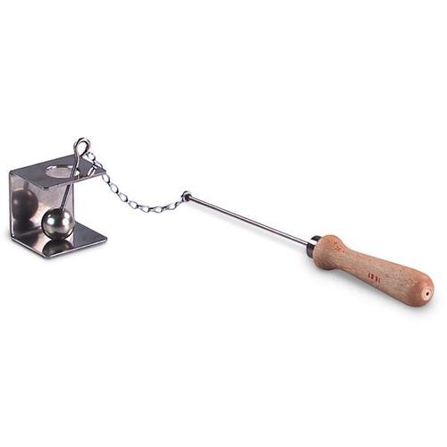 An arrangement for demonstrating the expansion of solids on heating. After heating in a burner flame, the ball no longer fits through the bore in the bracket. Steel ball with chain and handle.