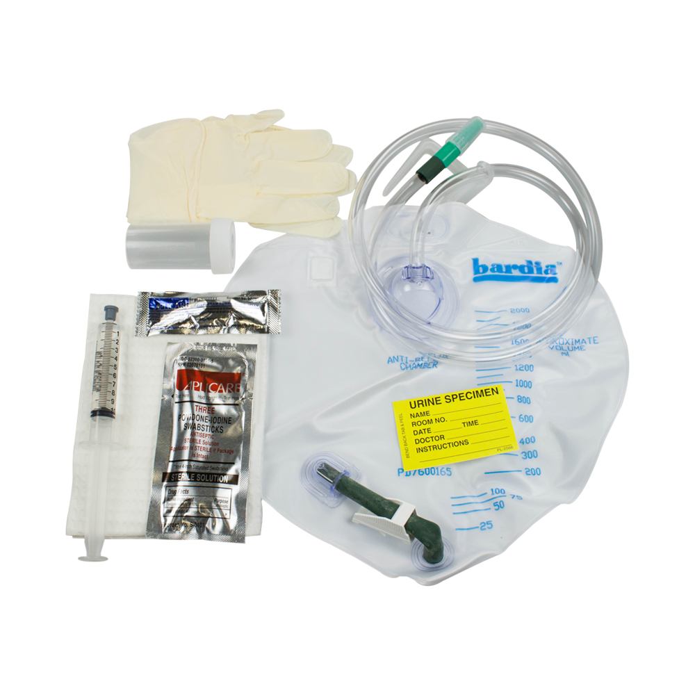CSR wrap covered tray Single-use; sterile Pre-filled inflation syringe for 5cc and 30-cc catheters Includes waterproof underpad, fenestrated drapes, three povidone iodine swab sticks, 5-g lubricating jelly, two exam gloves and specimen container with label
