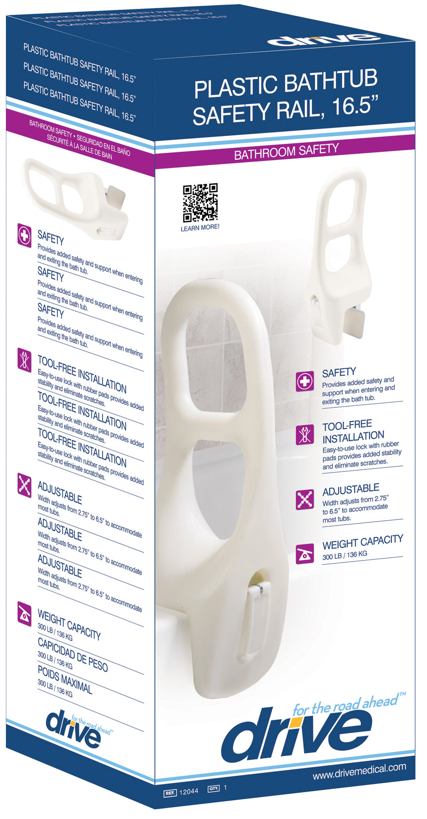 This Bath Shower Tub Grab Rail by Drive Medical was designed to fit just about any type of bathtub. The assist bar is an attractive white color which is aesthetically pleasing and was styled to perfectly fit for your needs. The bath rails clamp attaches by turning the locking mechanism which tightens the secure grip pads on all bath tub contact points. The pads prevent scratching of the tubs surface and ensure a secure fit. The shower rail is 16.5" in height and is easy to install without needing tools. This 16.5" model also features a second hand grip position providing support for users lying down in the bath tub. Not only will the Bath Shower Tub Grab Rail improve your bathing experience it will also blend into any bathroom decor.