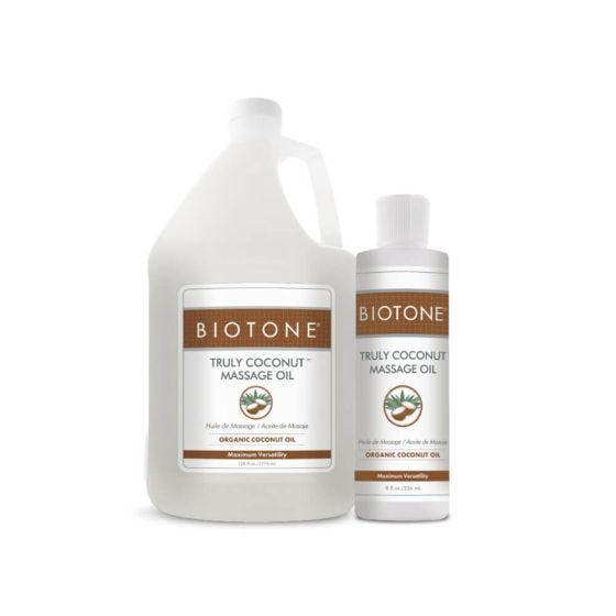 BIOTONE® Truly Coconut Massage Oil helps melt away tension and promotes deep relaxation with the natural aroma of organic, unrefined coconut oil. This oil provides an unsurpassed glide: light, versatile, and long-lasting. From high glide to deep tissue, it is suited to all massage modalities. It washes out from linens easily and is an ideal addition to your treatment room. Available in 8oz and 128oz bottles.