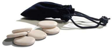 6 Small Ovular White Marble Stones. Comes pack in drawstring bag. Commonly used for cool stone massage around the facial area after hot stone massages