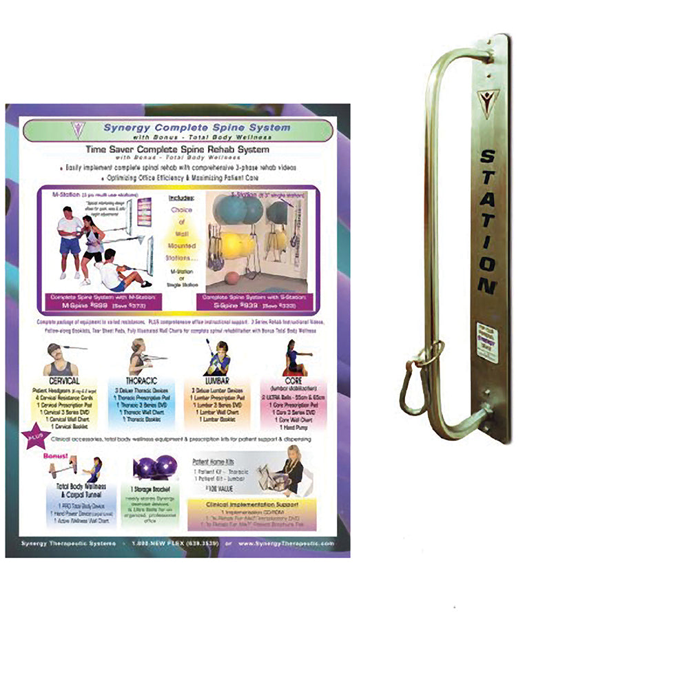 Increase rehabilitation services, improve patient care and increase revenue. Wall-mounted stations feature an interlocking design that allows for quick, easy and safe height adjustment. Complete package of equipment in varied resistances. Include comprehensive office instructional support of targeted protocols: "3 Series" progressive rehab videos, follow-along booklets, tear sheet pads and fully illustrated wall charts. S-Station is a 5' 3" single-station option. M-Station is a 3-piece multiuse station option. Includes all instructional and exercise equipment for 5 rehabilitation programs: cervical, thoracic, lumbar, core stabilization and total body wellness.
