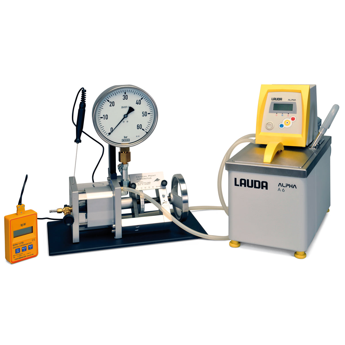 A high-precision device for studying the compression and liquefaction of a gas, determining the critical point and recording isotherms in p-V (Clapeyron) diagrams. The test gas is sulfur hexafluoride (SF6), which has a critical temperature of 318.6 K (45.5°C) and a critical pressure of 3.76 MPa (37.6 bars), allowing for a simple experiment set-up.