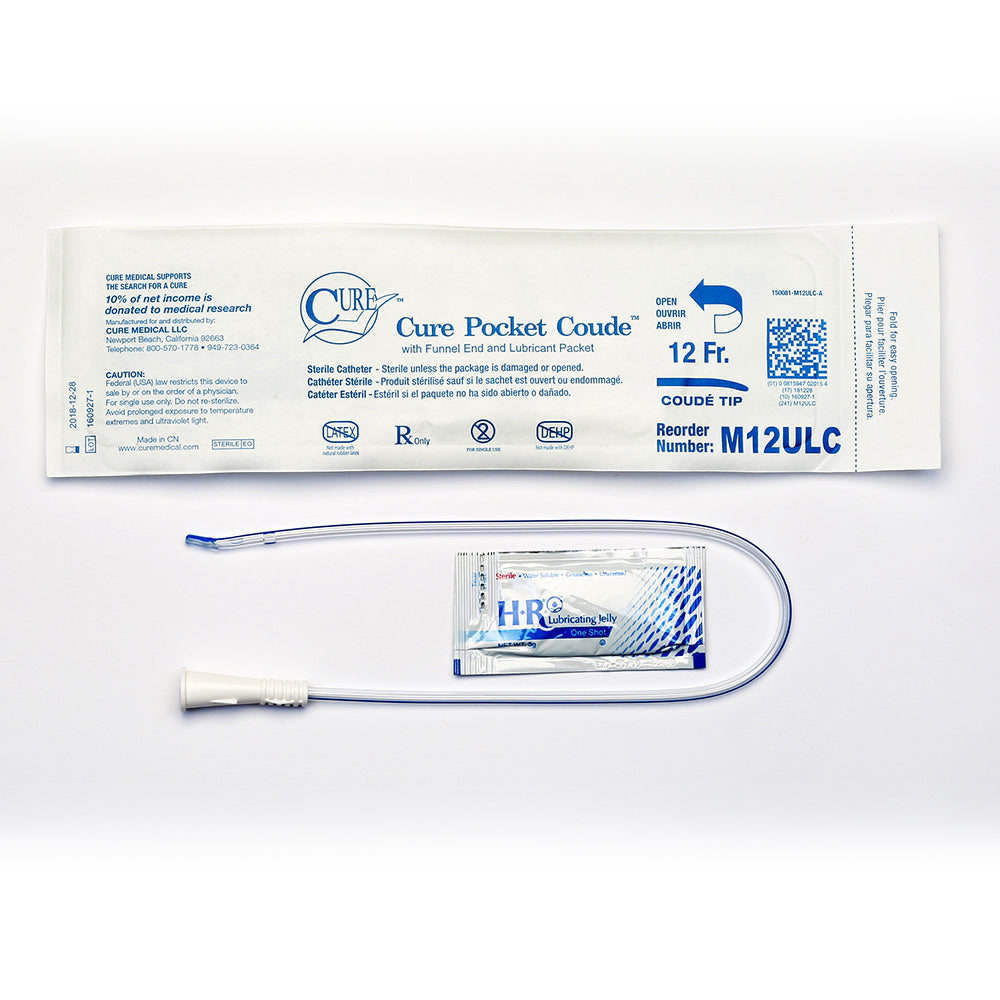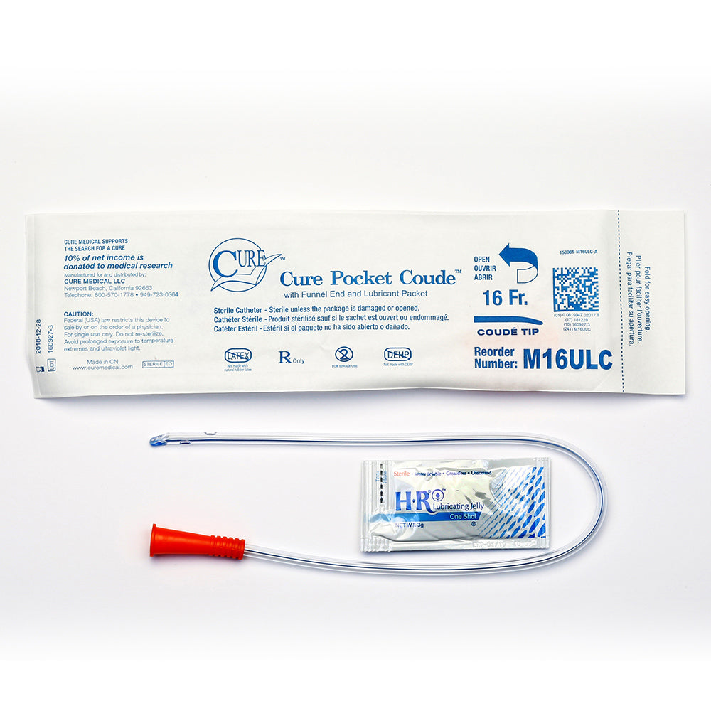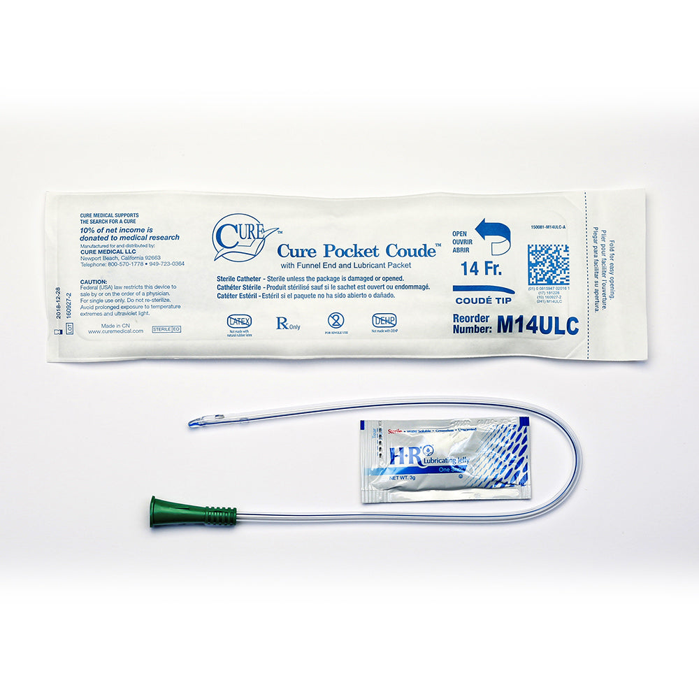 An ideal choice for individuals who value the convenience and discretion of carrying a catheter in a pant pocket or small bag. Sterile, single use male catheter, U-shaped Made with polished eyelets on a straight tip and funnel end in a standard (16˝) length. Coude tip versions include a packet of water-soluble lubricant. Large flaps on the pouch enable a better grip for easy opening with minimal effort. High quality materials – not made with DEHP/DINP, BPA, or natural rubber latex. Available sizes: 12FR, 14FR, 16FR