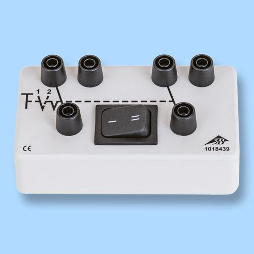 Double-pole double throw (DPDT) change-over switch in a robust casing with high dielectric strength. Connection is made via 4-mm safety sockets.