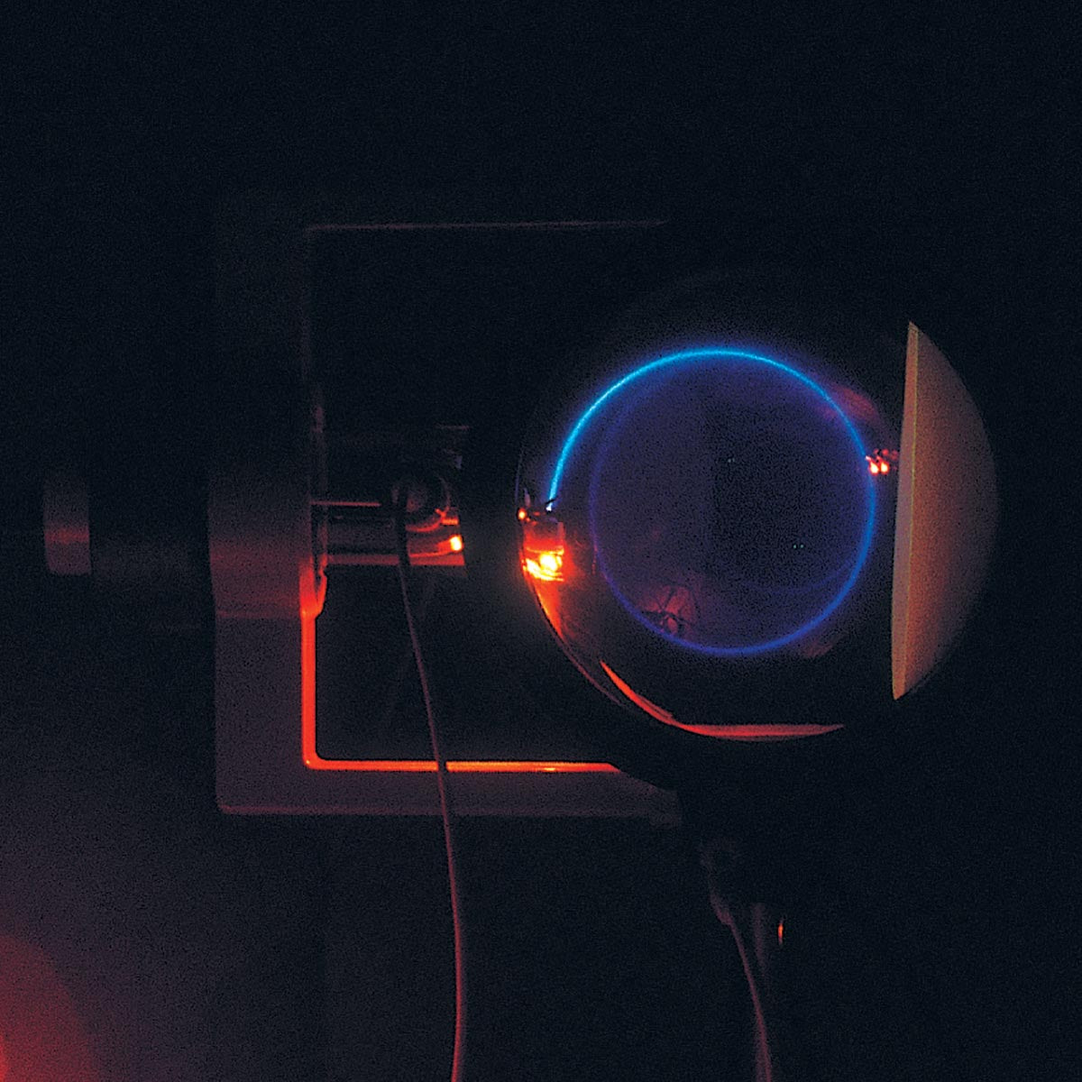 The electron paths are rendered visible in the form of fine luminescent beams through impact excitation of the neon atoms.