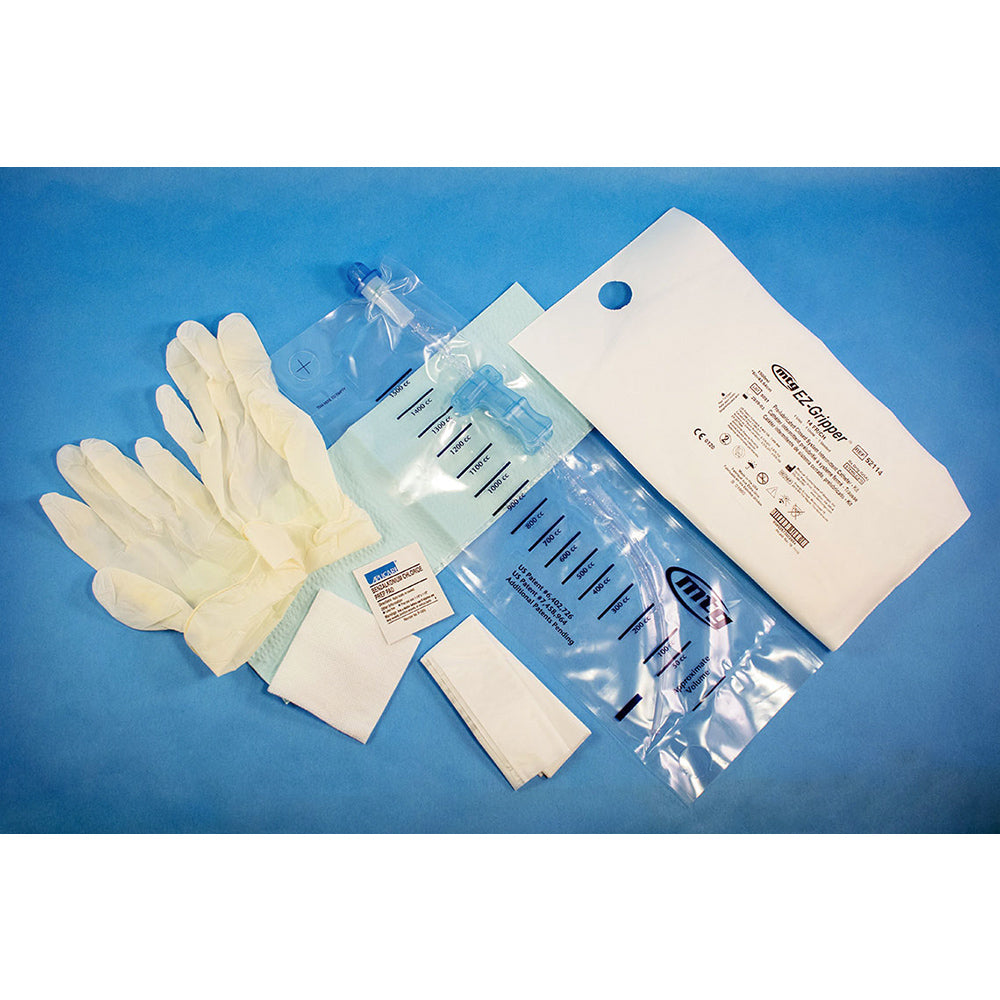 The catheter is pre-lubricated, so setup time is minimal. The MTG introducer tip is designed to reduce the risk of recurrent Urinary Tract Infections (see video for proper usage instructions). Soft, fire polished, smooth eyelets allows for comfortable passage through the urethra and into the bladder. Offset eyelets, located near the tip of the catheter, provide drainage from two points within the bladder. The MTG EZ-Advancer® valve secures the catheter tube after each forward advancement, preventing retraction back into the bag during insertion. The catheter bag protects the sterility of the tube and collects the urine. Sterile sample can be collected. The catheter is available in 12, 14 and 16 Fr., 16” length. The “Tear here to empty” perforation is easy to rip, allowing for fluid to be poured into the toilet. The collection bag also has access finger holes for holding during filling and draining. 100% latex-free Benzalkonium chloride (BZK) clear, odor-free, alcohol-free, cleansing prep DEHP-free catheter tube Includes privacy bag for discreet disposal of used supplies