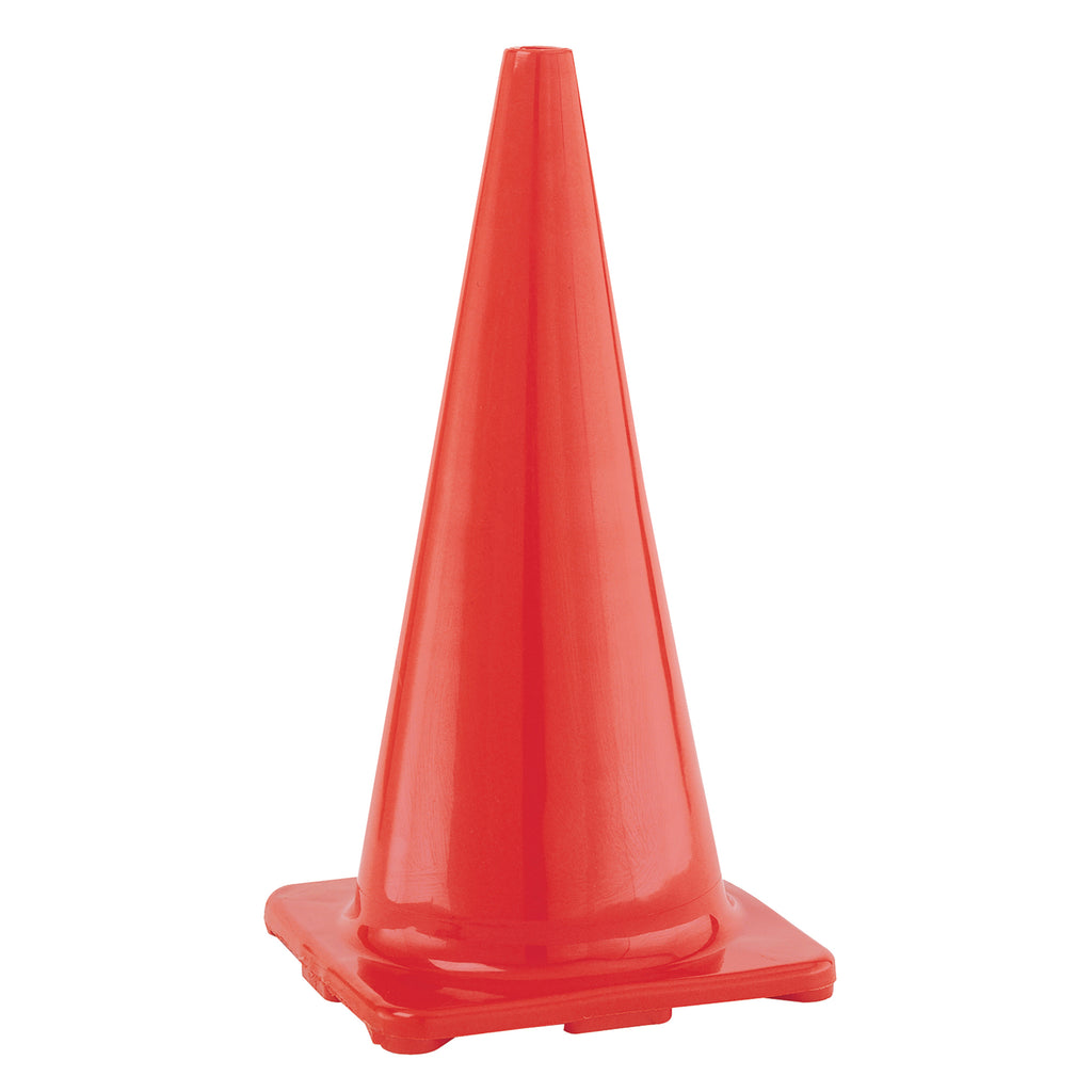 High-visibility flexible vinyl cones. Single-piece-construction cones with heavyweight base. Color: orange. Height: 6".