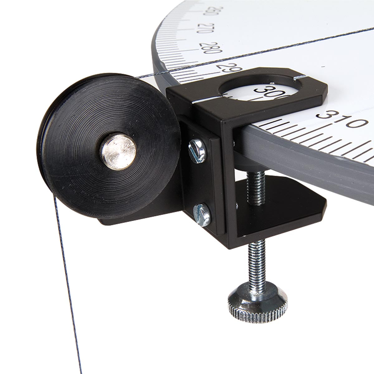 Equipment for quantitative investigation of the combination and resolution of forces, consisting of a circular workplate on a stable base with dual protractor scale. Weights from set of three weight holders with slotted weights (U30019) (included), are suspended from 3 cords strung over pulleys with ball bearings.