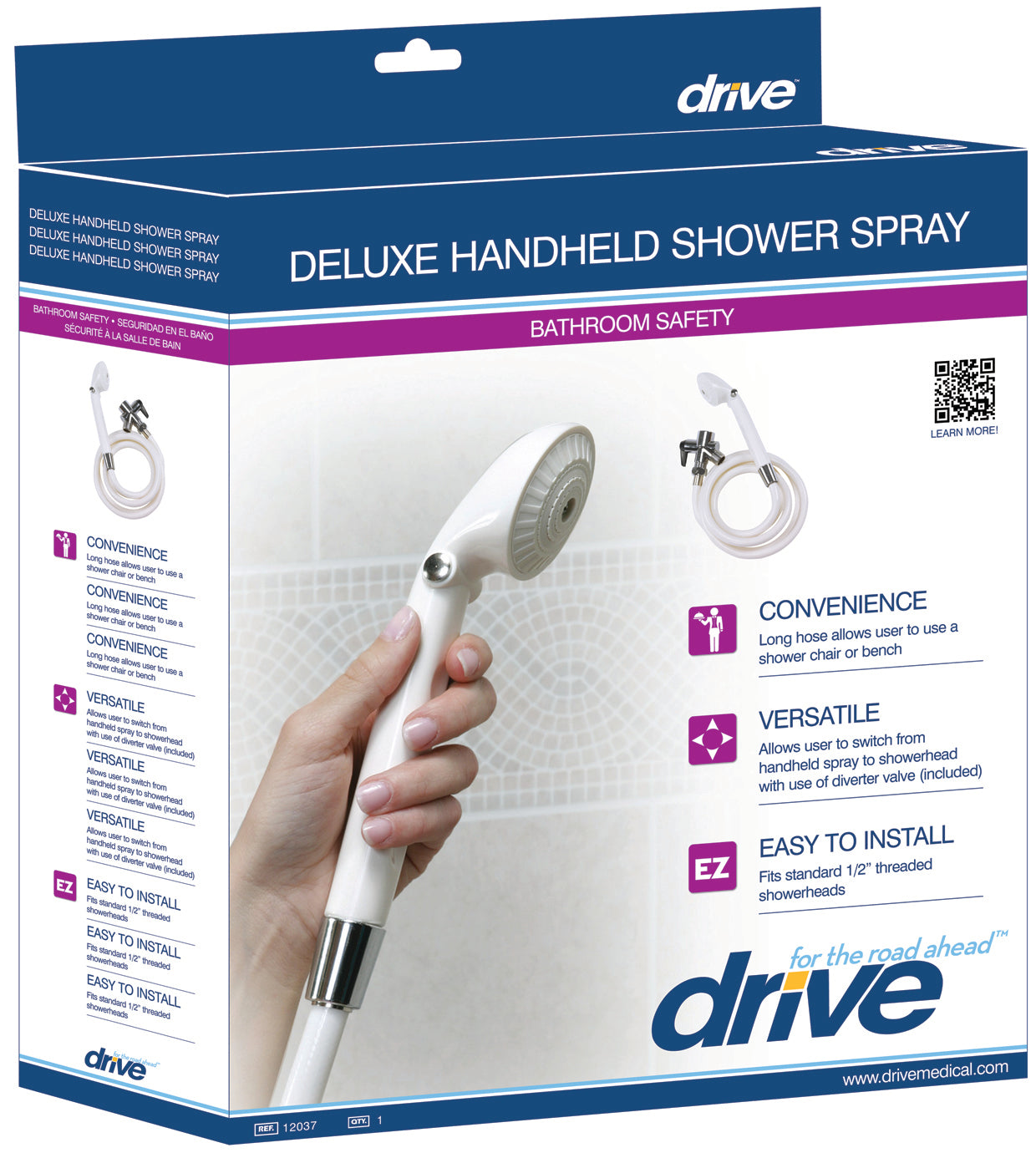 The Handheld Shower Head Spray with Diverter Valve by Drive Medical was designed to provide the user with a relaxing experience when showering. Included with the hand held shower spray is a diverter valve which allows the user to switch water flow from the regular shower head to the handheld shower spray with the flick of a switch. The 80" white reinforced hose is durable and allows for maneuverability increasing control over your bathing experience. When using your traditional shower head the handheld shower spray can be anchored in the holder which is included. An added feature built into the handle is an on / off switch which allows the user a simple way to turn the water flow on or off. The Handheld Shower Head Spray by Drive Medical will take your bathing experience to a new level.