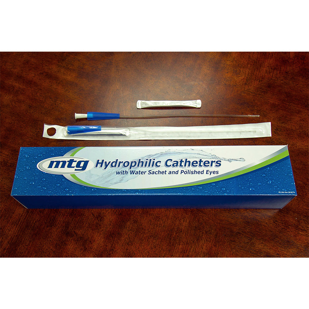 Slippery hydrophilic lubrication makes catheter insertion much easier with less irritation. Saves time — just bend the package to begin lubricating the catheter with the included sterile water sachet. Invisible, sheer lubricant is less messy than gels. During coating activation, the outer package can be hung from the bathroom wall or the sink via an included adhesive tab. Click to see video showing how easy this catheter is to use Smooth, fire polished eyelets (drainage holes) allow for comfortable passage through the urethra and into the bladder. Offset eyes, located near the tip of the catheter provide drainage from two points within the bladder. This catheter is available in 12, 14 and 16 French sizes. Male catheters are 16” in length. Also available with soft vinyl tubing for users with sensation issues DEHP-free catheter tube Color coded funnel indicates French size