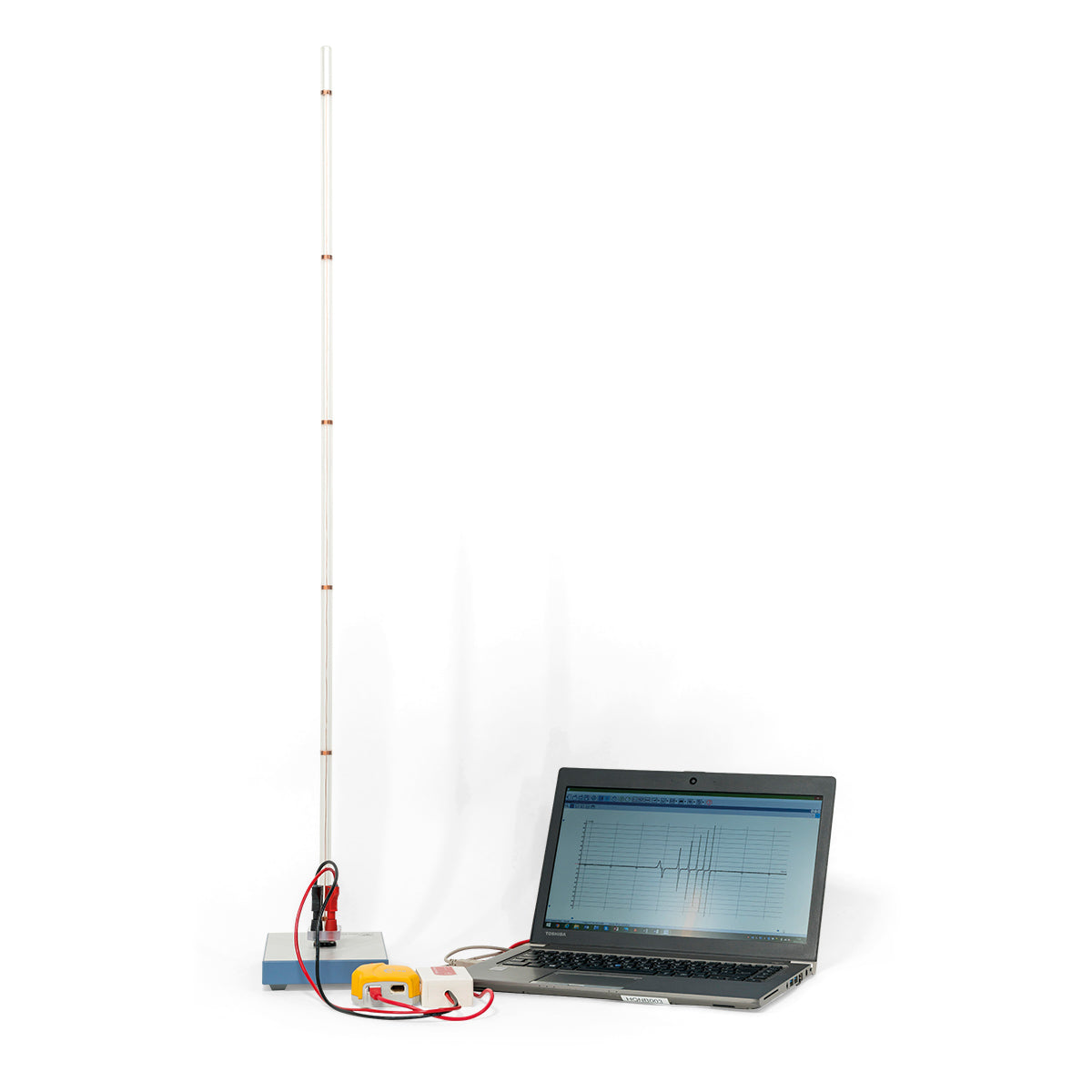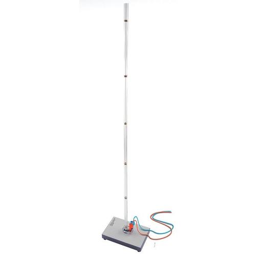 Guinea and feather tube apparatus with 6 induction coils connected in series. When a bar magnet (included in the scope of delivery) is dropped in the tube, a voltage is induced as it passes each of the respective coils. Due to the magnet's free-fall acceleration caused by gravity, the voltage peaks increase proportionally with the time (speed proportional to time), and the time intervals between the voltage peaks become ever shorter. The voltage characteristic can be plotted using any conventional storage oscilloscope or with a computer interface.